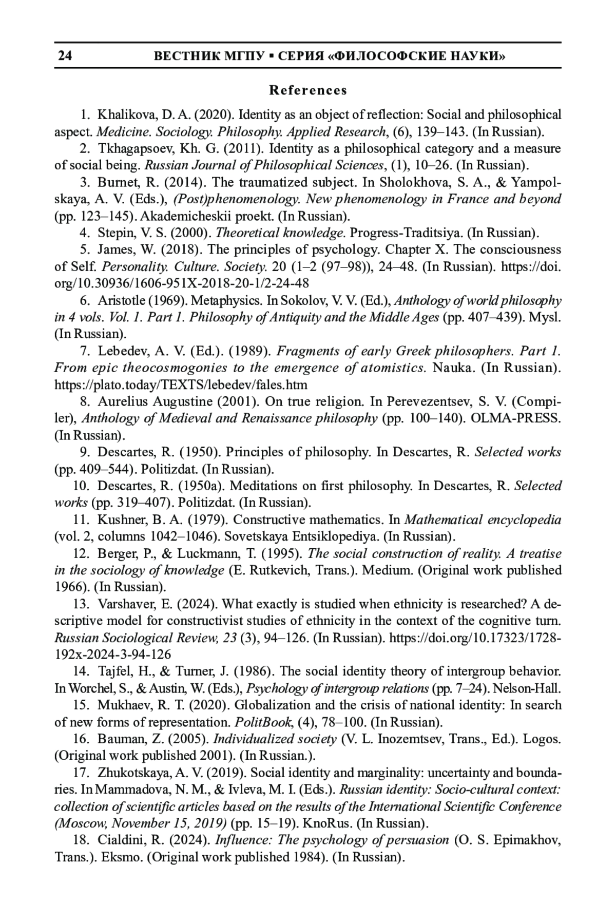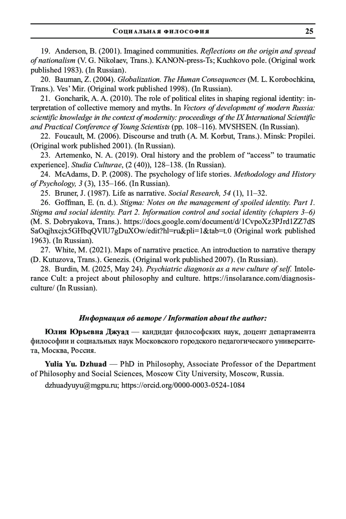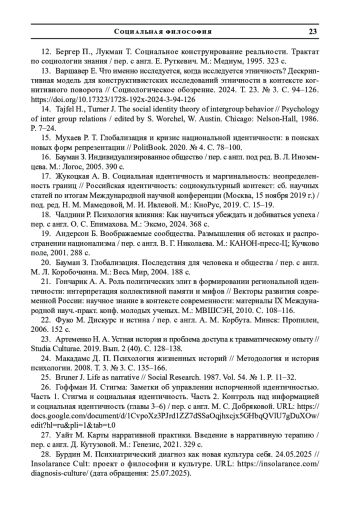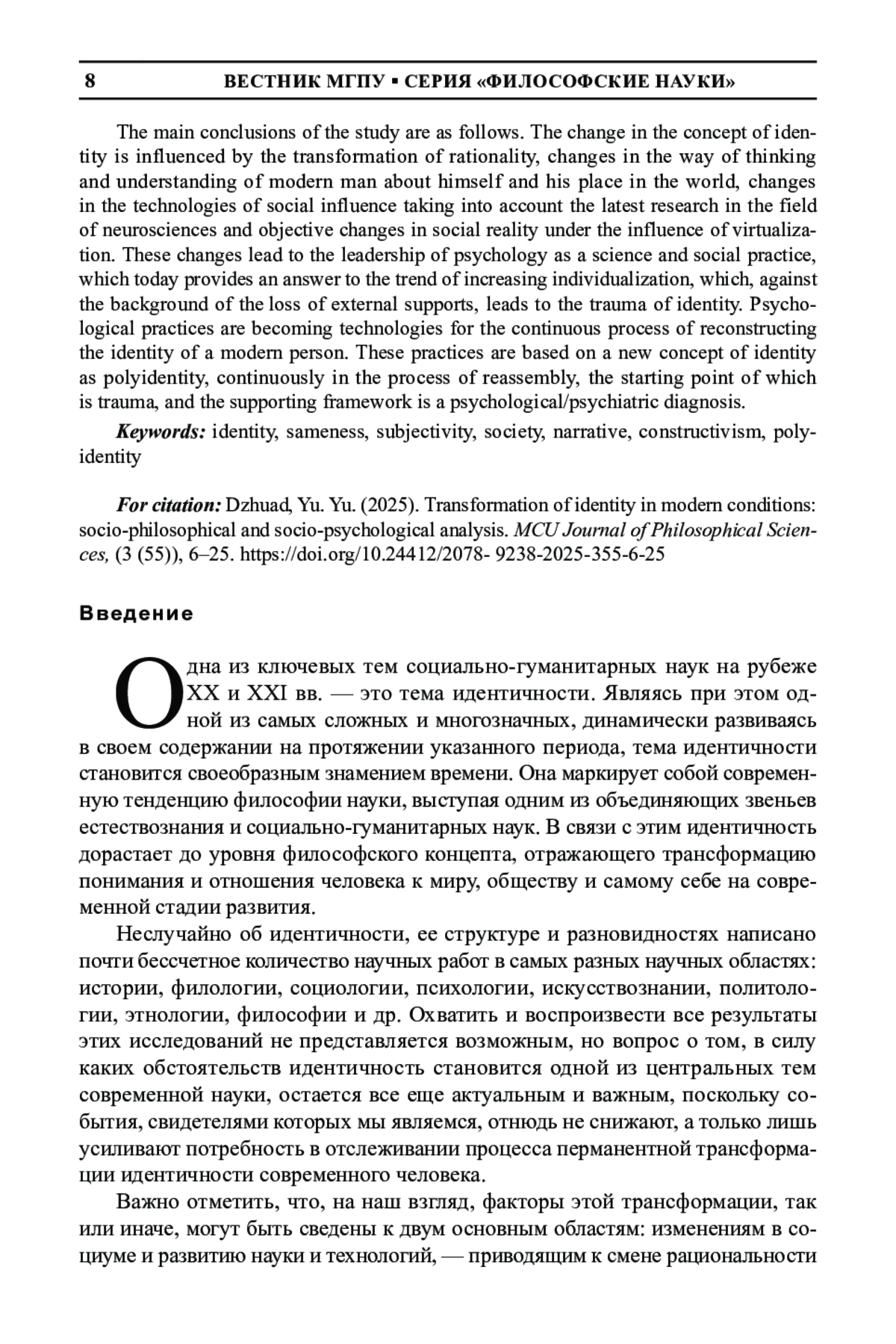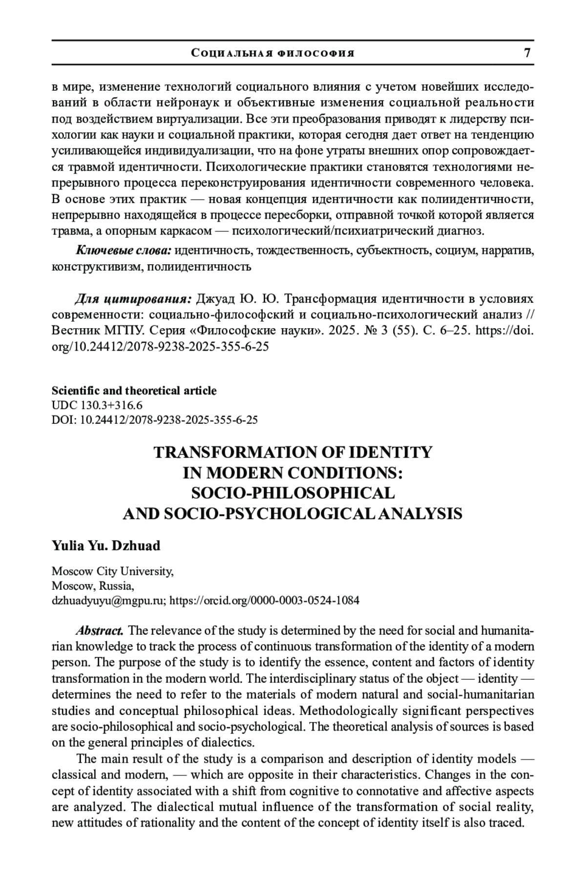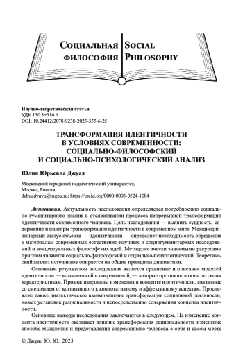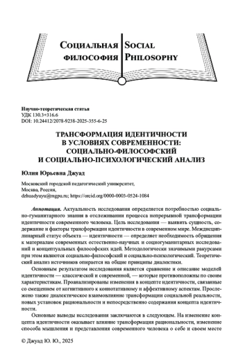 ДЖУАД Ю. Ю. ТРАНСФОРМАЦИЯ ИДЕНТИЧНОСТИ В УСЛОВИЯХ СОВРЕМЕННОСТИ: СОЦИАЛЬНО-ФИЛОСОФСКИЙ И СОЦИАЛЬНО-ПСИХОЛОГИЧЕСКИЙ АНАЛИЗ // ВЕСТНИК МГПУ. СЕРИЯ: ФИЛОСОФСКИЕ НАУКИ. 2025. № 3 (55)