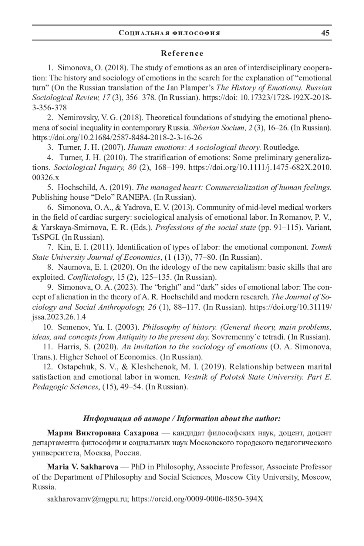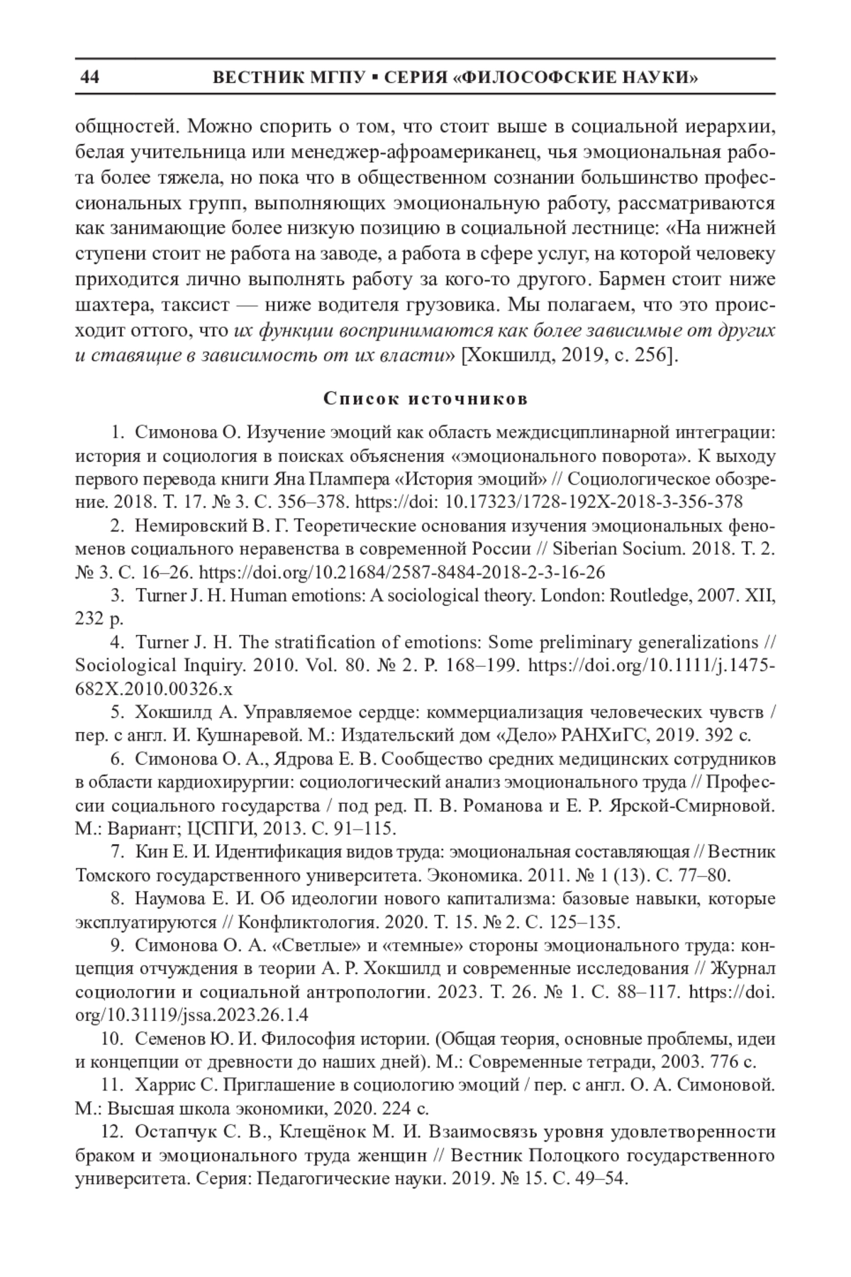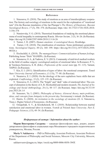 9. Симонова О. А. “Светлые” и “темные” стороны эмоционального труда: концепция отчуждения в теории А. Р. Хокшилд и современные исследования // Журнал социологии и социальной антропологии. 2023. Т. 26. № 1. С. 88-117. DOI: 10.31119/jssa.2023.26.1.4 EDN: JUEVKJ