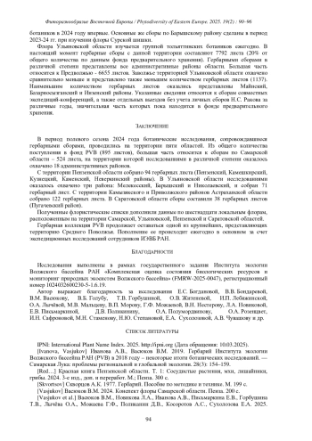 8. [Vasjukov et al.] Васюков В.М., Степанова Н.Ю., Чувашов А.В., Мальцев М.В. 2024. Особенности флоры антропогенно нарушенных территорий дельты реки Волги. - Фиторазнообразие Восточной Европы. 18(4): 15-32. DOI: 10.24412/2072-8816-2024-18-4-15-32 EDN: TDGZKH