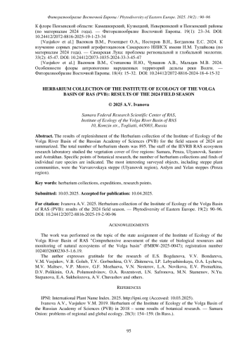 2. [Ivanova, Vasjukov] Иванова А.В., Васюков В.М. 2019. Гербарий Института экологии Волжского бассейна РАН (PVB) в 2018 году - некоторые итоги ботанических исследований. - Самарская Лука: проблемы региональной и глобальной экологии. 28(3): 154-159. EDN: NCMFZZ