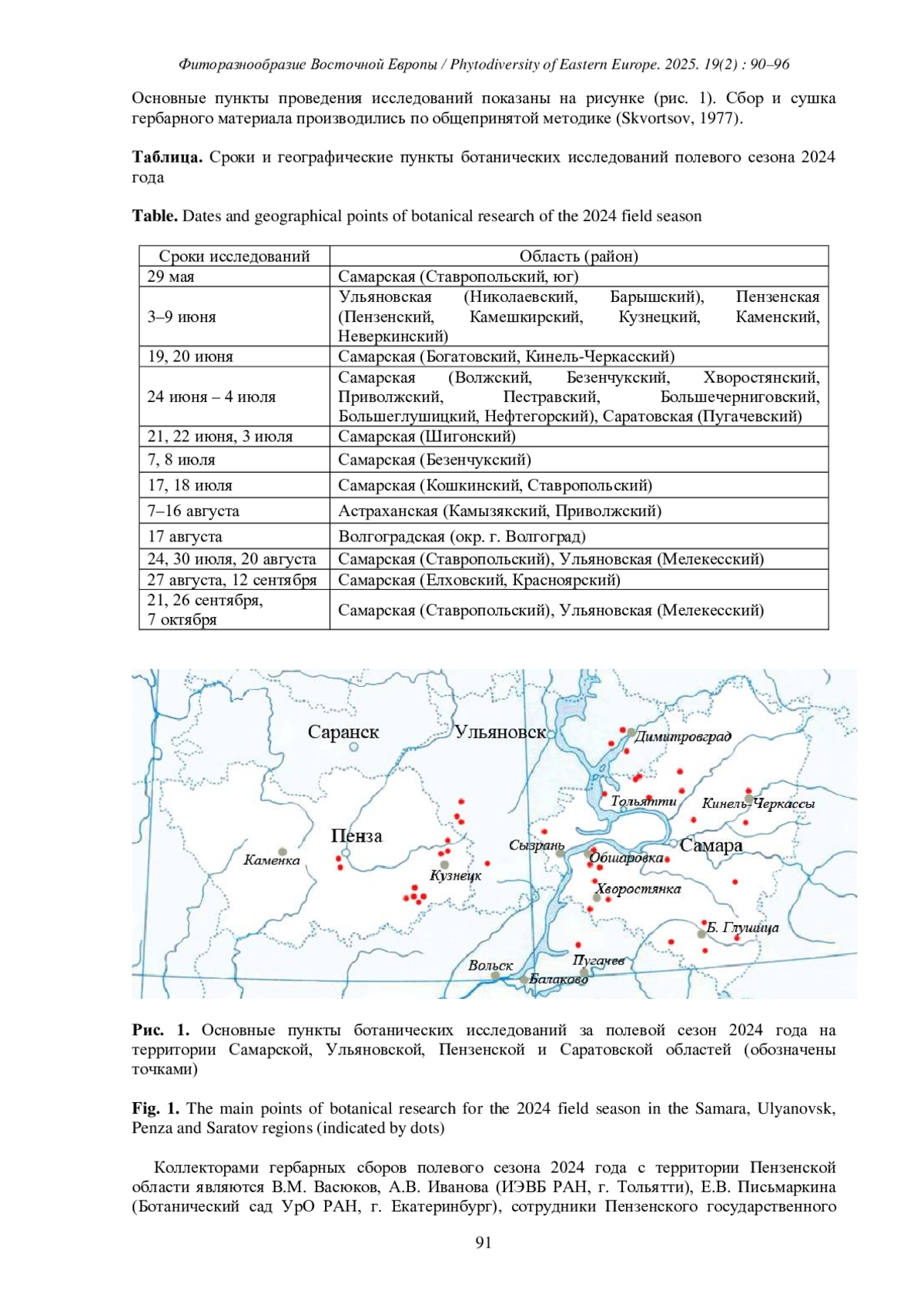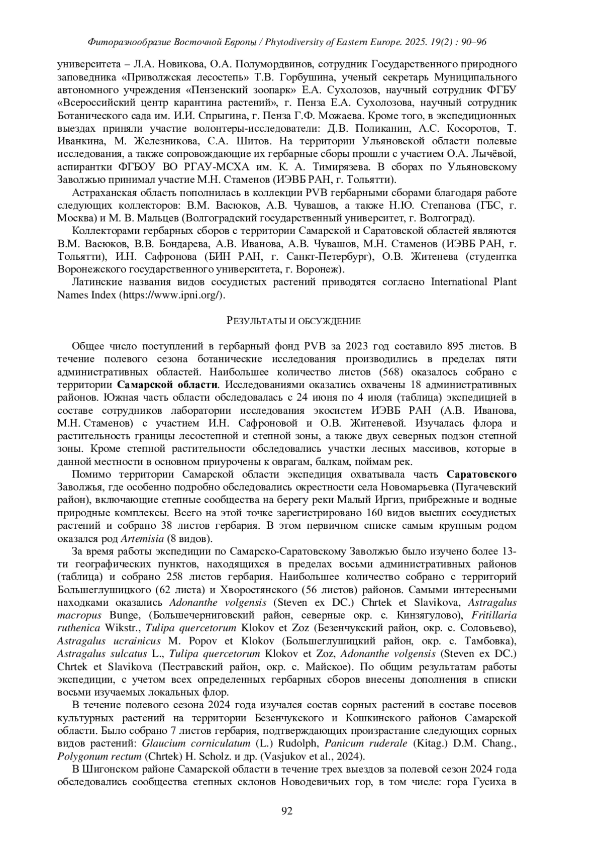 Общее число поступлений в гербарный фонд PVB за 2023 год составило 895 листов. В течение полевого сезона ботанические исследования производились в пределах пяти административных областей. Наибольшее количество листов (568) оказалось собрано с территории Самарской области. Исследованиями оказались охвачены 18 административных районов. Южная часть области обследовалась с 24 июня по 4 июля (таблица) экспедицией в составе сотрудников лаборатории исследования экосистем ИЭВБ РАН (А. В. Иванова, М. Н. Стаменов) с участием И. Н. Сафроновой и О. В. Житеневой. Изучалась флора и растительность границы лесостепной и степной зоны, а также двух северных подзон степной зоны. Кроме степной растительности обследовались участки лесных массивов, которые в данной местности в основном приурочены к оврагам, балкам, поймам рек.