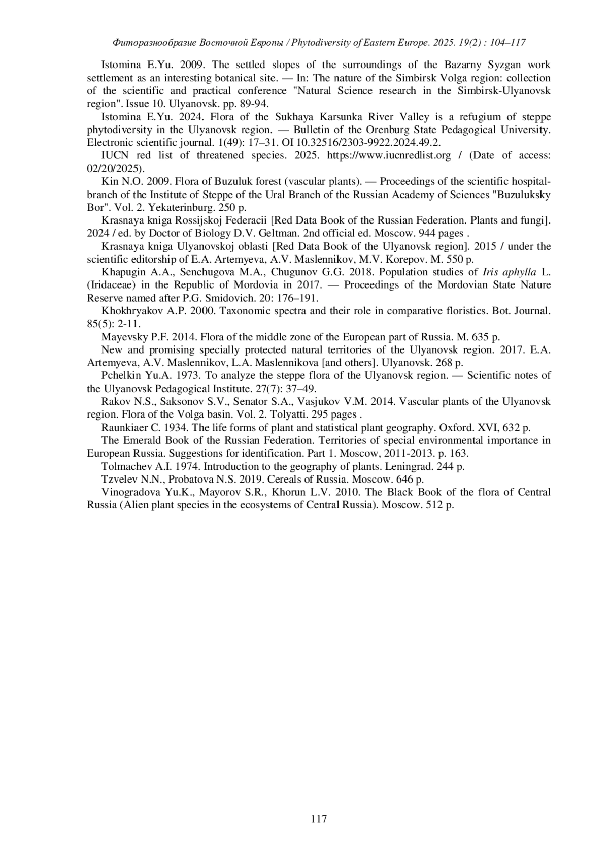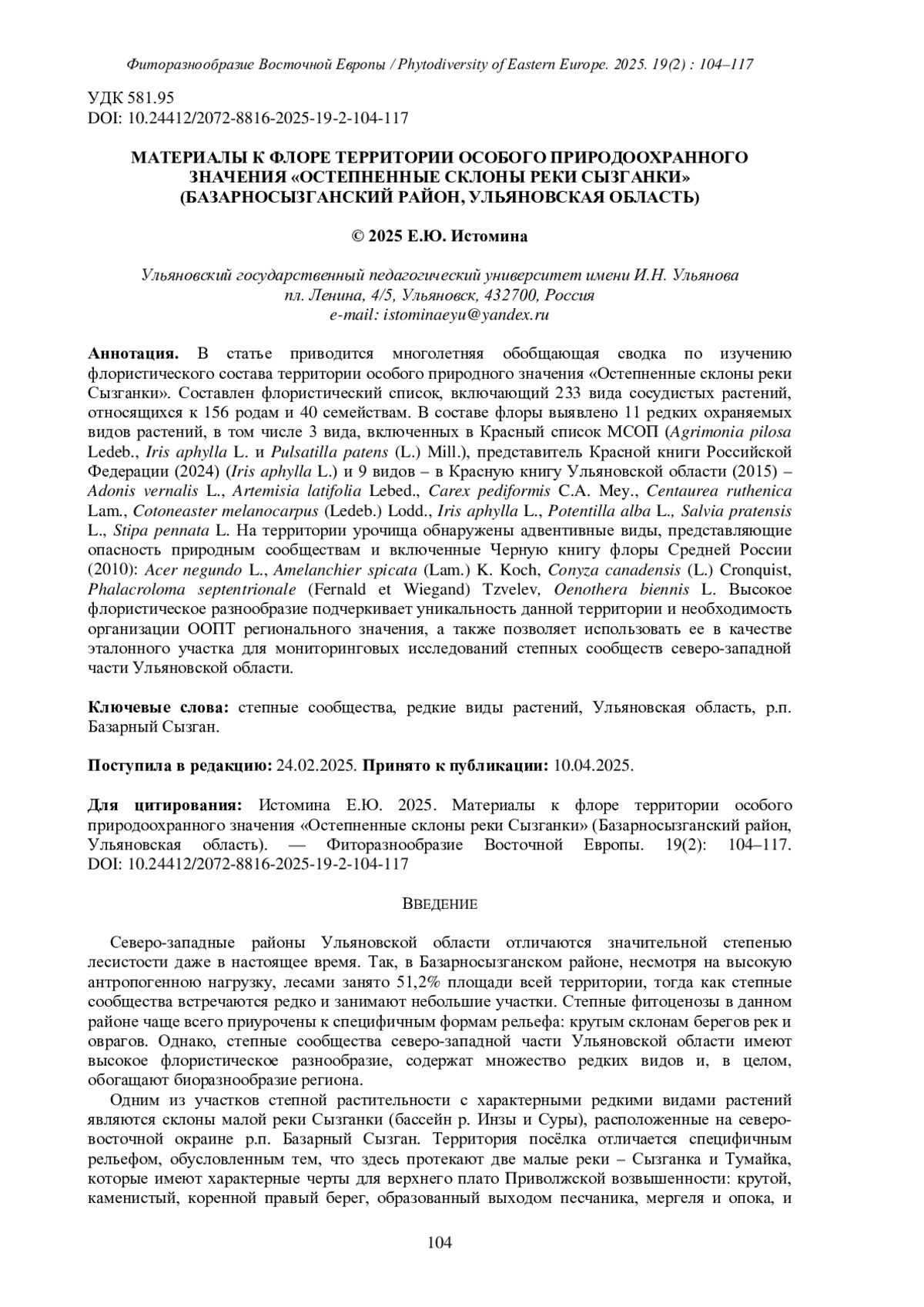 ИСТОМИНА Е.Ю. МАТЕРИАЛЫ К ФЛОРЕ ТЕРРИТОРИИ ОСОБОГО ПРИРОДООХРАННОГО ЗНАЧЕНИЯ «ОСТЕПНЕННЫЕ СКЛОНЫ РЕКИ СЫЗГАНКИ» (БАЗАРНОСЫЗГАНСКИЙ РАЙОН, УЛЬЯНОВСКАЯ ОБЛАСТЬ) // ФИТОРАЗНООБРАЗИЕ ВОСТОЧНОЙ ЕВРОПЫ. 2025. Т. 19 № 2