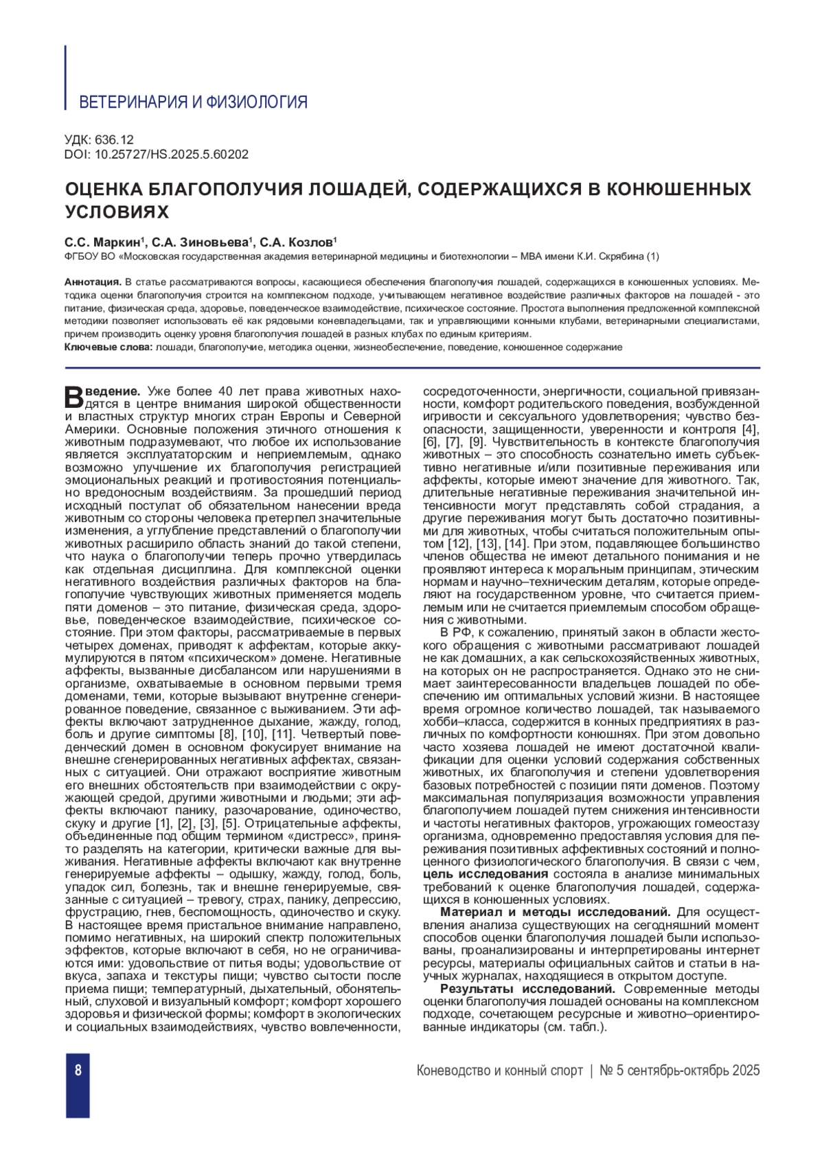 12. Маркин, С.С. Оценка клинического состояния полновозрастных лошадей хобби-класса, содержащихся в условиях городского конного клуба / Маркин С.С., Зиновьева С.А., Козлов С.А.// Материалы V Международной научно-практической конференции “Приоритетные векторы развития промышленности и сельского хозяйства”. - Макеевка: “Донбасская аграрная академия”, 2022. - Т. II. - С. 78-82.