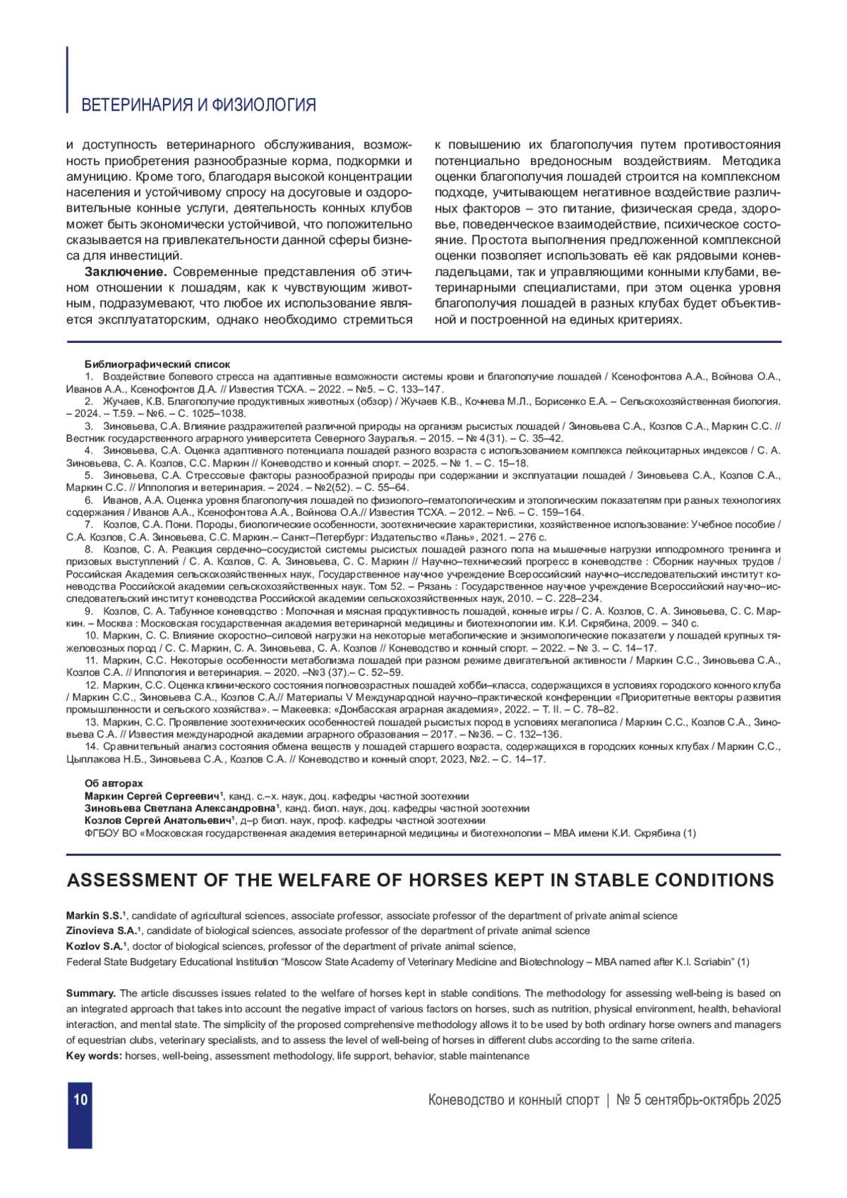 11. Маркин, С.С. Некоторые особенности метаболизма лошадей при разном режиме двигательной активности / Маркин С.С., Зиновьева С.А., Козлов С.А. // Иппология и ветеринария. - 2020. -№3 (37).- С. 52-59.