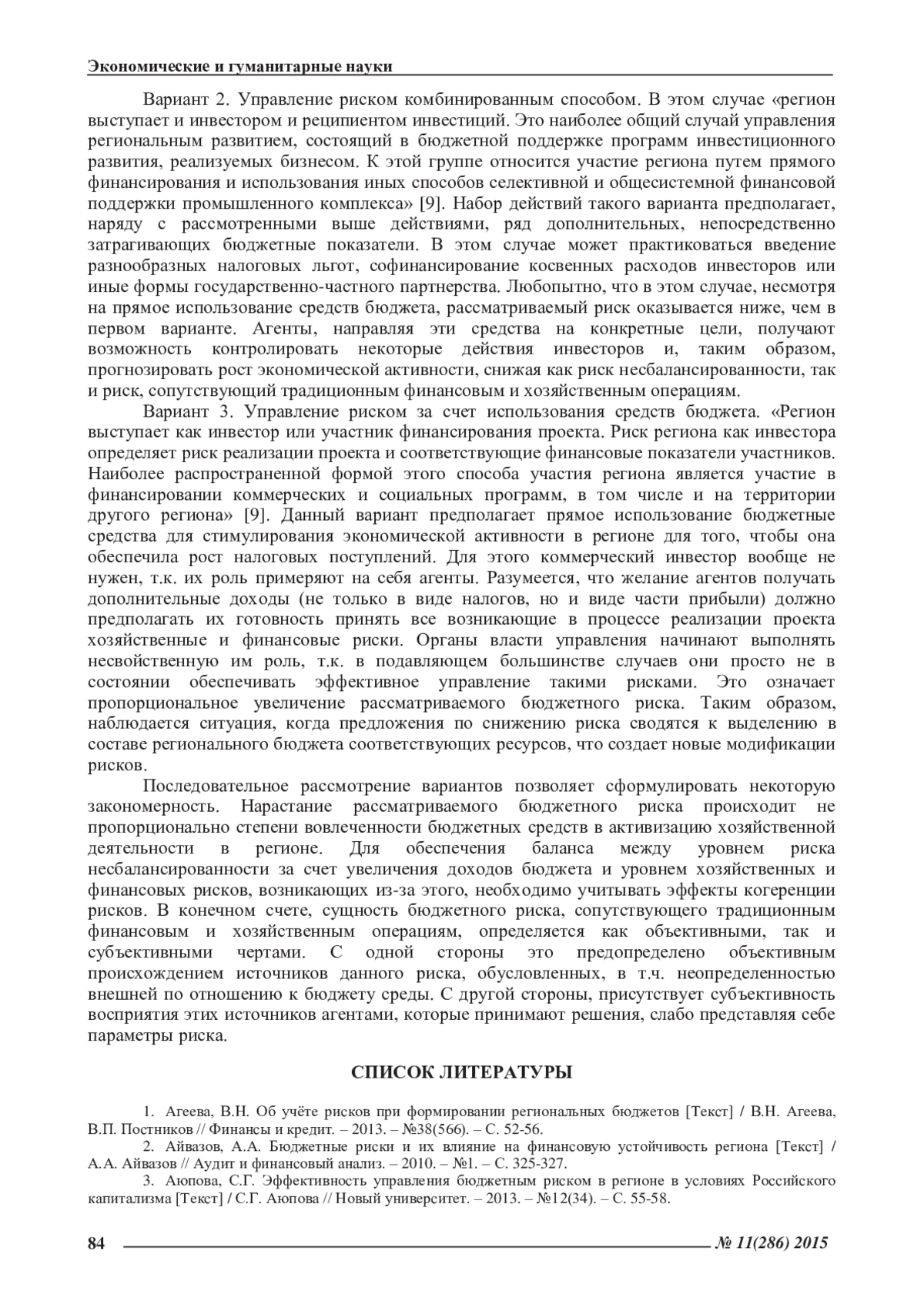 3. Аюпова, С.Г. Эффективность управления бюджетным риском в регионе в условиях Российского капитализма [Текст] / С.Г. Аюпова // Новый университет. - 2013. - №12(34). - С. 55-58. EDN: RWQRQV
