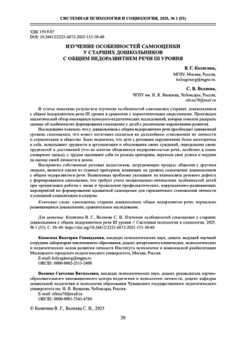 8. Римашевская Л. С., Гультяева О. А. Исследование особенностей самооценки детей старшего дошкольного возраста // Современное дошкольное образование. 2022. № 3 (111). С. 26-35. DOI: 10.24412/2782-4519-2022-3111-26-35 EDN: USARZD