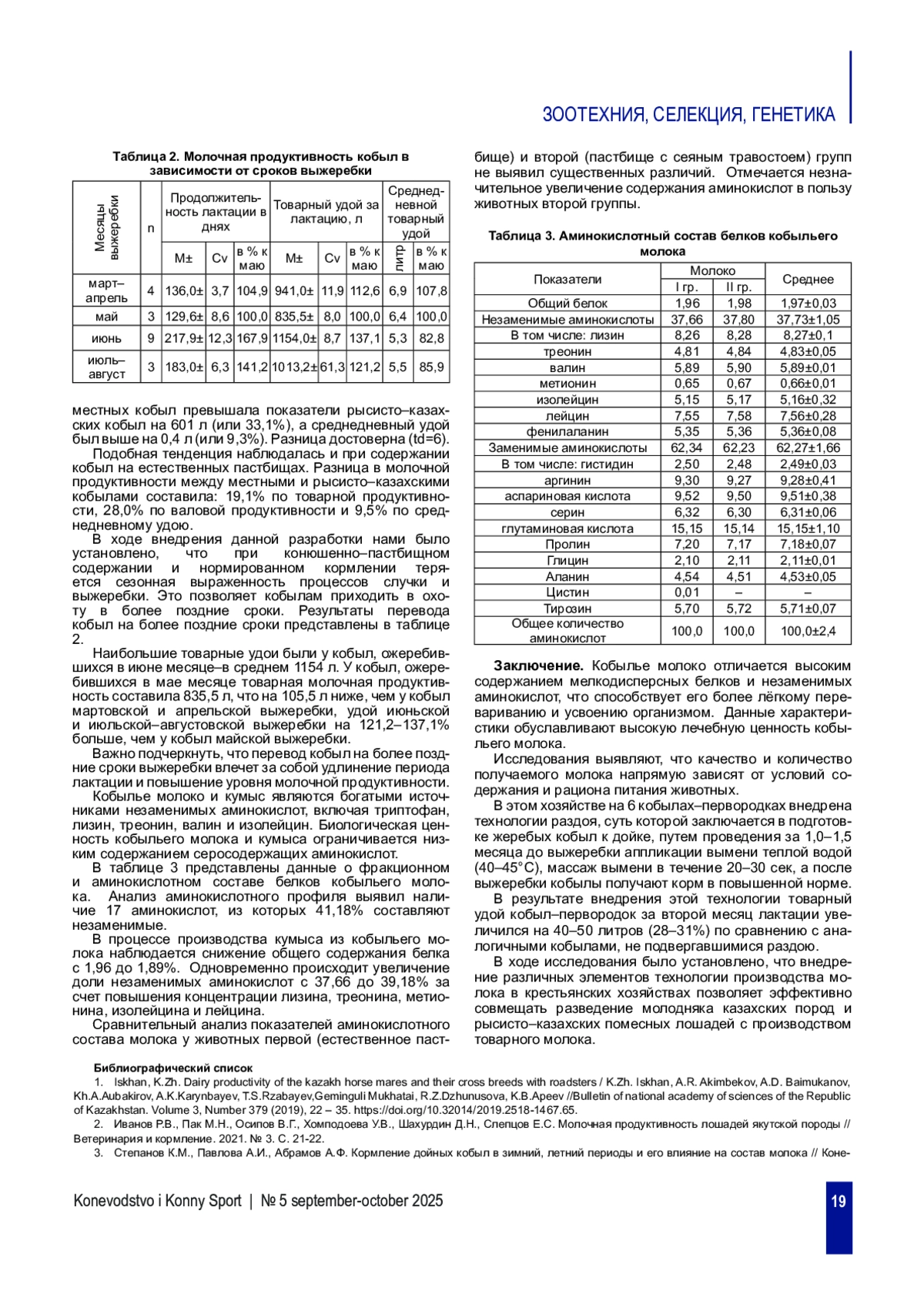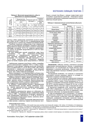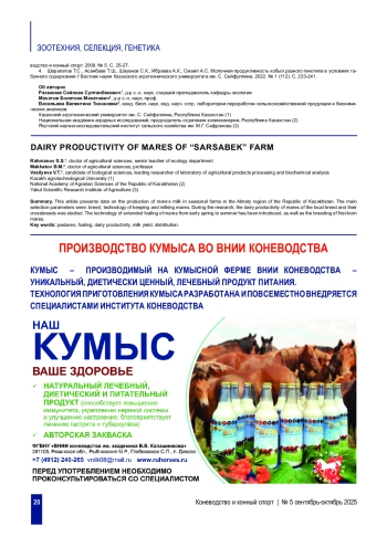 РАХМАНОВ С. С., МАХАТОВ Б. М., ВАСИЛЬЕВА В. Т. МОЛОЧНАЯ ПРОДУКТИВНОСТЬ КОБЫЛ КРЕСТЬЯНСКОГО ХОЗЯЙСТВА «САРСАБЕК» // КОНЕВОДСТВО И КОННЫЙ СПОРТ. 2025. № 5