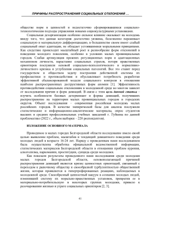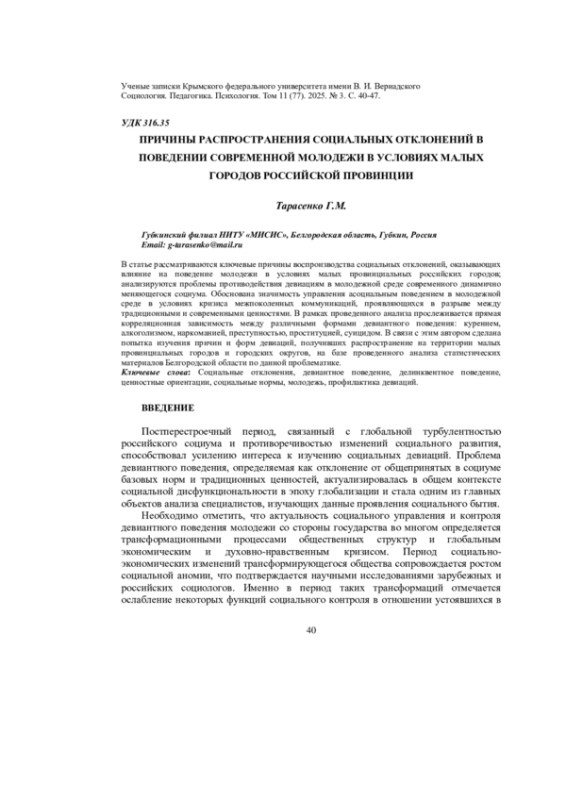 В статье рассматриваются ключевые причины воспроизводства социальных отклонений, оказывающих влияние на поведение молодежи в условиях малых провинциальных российских городов; анализируются проблемы противодействия девиациям в молодежной среде современного динамично меняющегося социума. Обоснована значимость управления асоциальным поведением в молодежной среде в условиях кризиса межпоколенных коммуникаций, проявляющихся в разрыве между традиционными и современными ценностями. В рамках проведенного анализа прослеживается прямая корреляционная зависимость между различными формами девиантного поведения: курением, алкоголизмом, наркоманией, преступностью, проституцией, суицидом. В связи с этим автором сделана попытка изучения причин и форм девиаций, получивших распространение на территории малых провинциальных городов и городских округов, на базе проведенного анализа статистических материалов Белгородской области по данной проблематик.