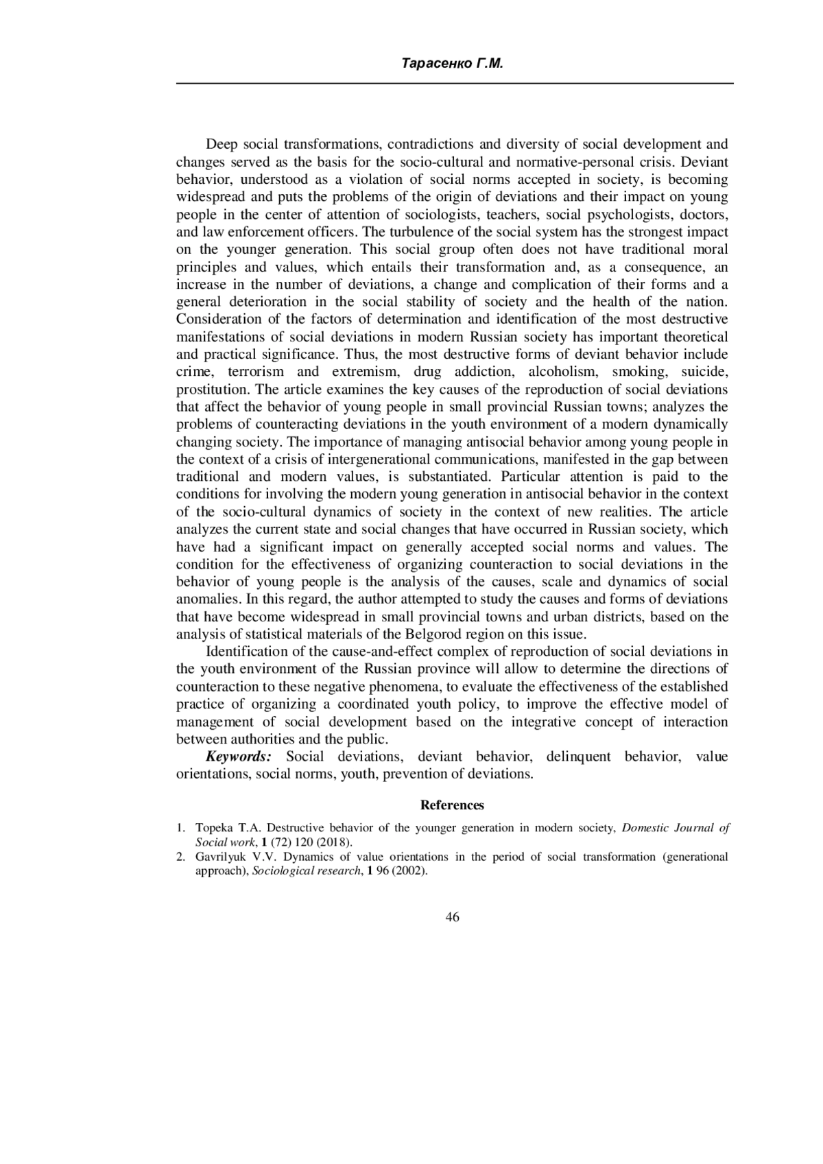 1. Топеха Т.А. Деструктивное поведение молодого поколения в современном обществе / Т.А. Топеха // Отечественный журнал социальной работы. - 2018. - № 1(72). - С. 120-124.