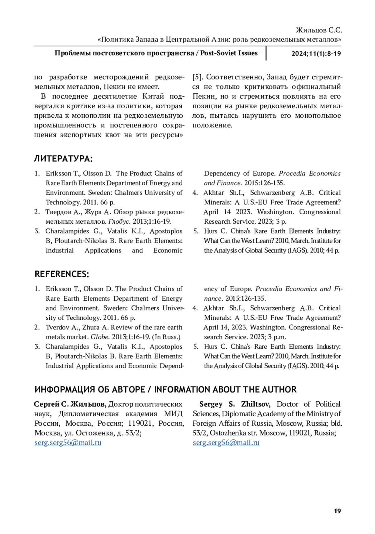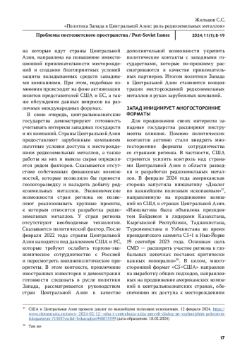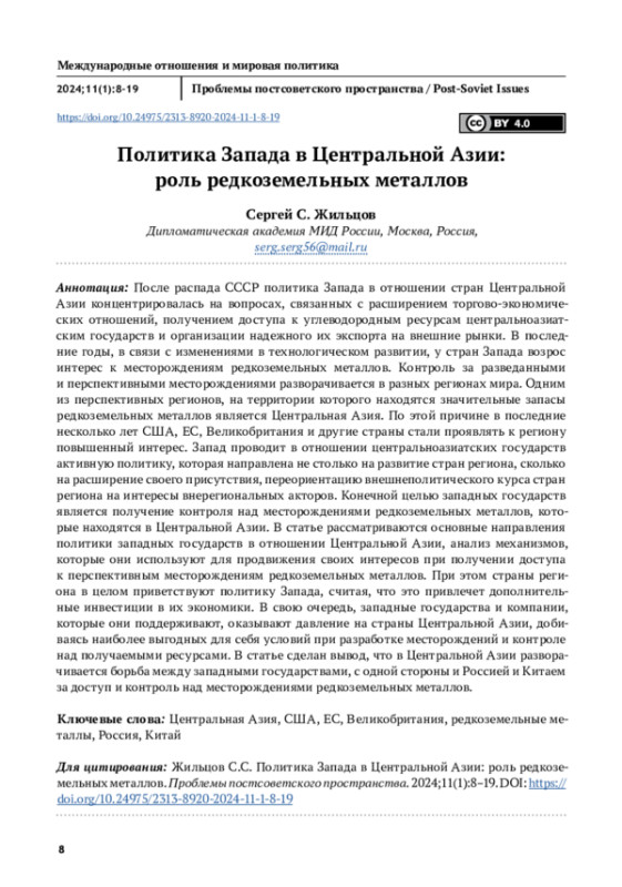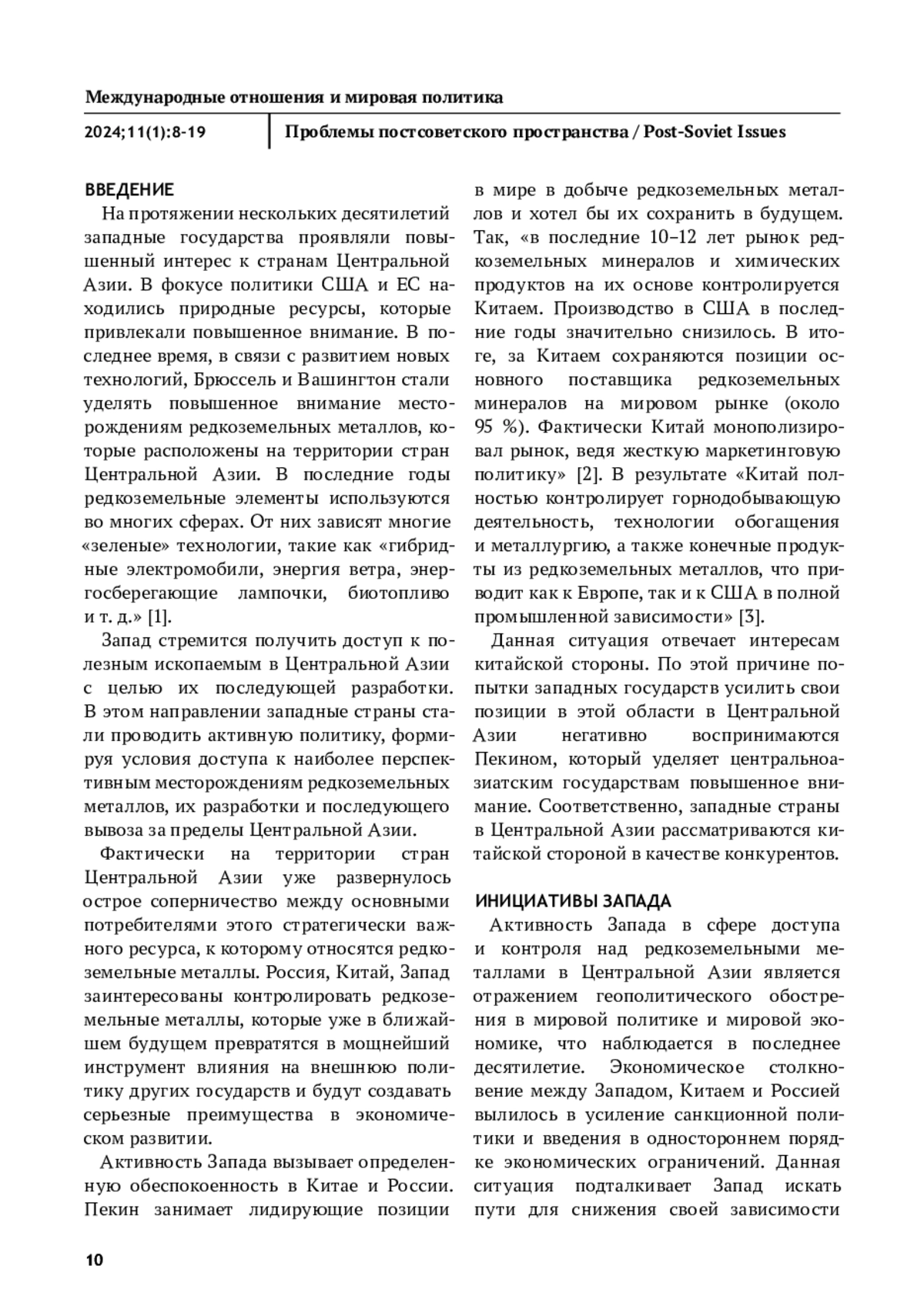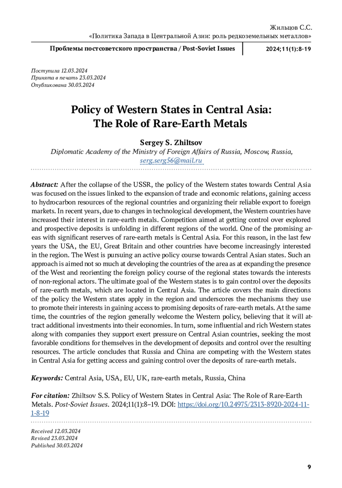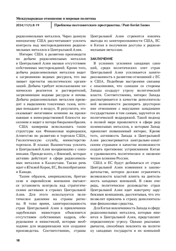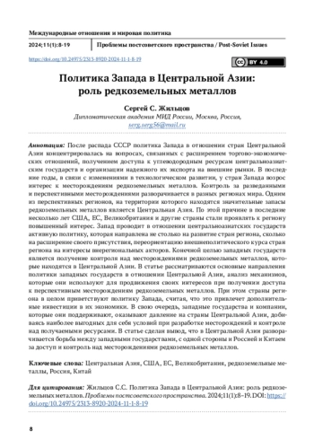 После распада СССР политика Запада в отношении стран Центральной Азии концентрировалась на вопросах, связанных с расширением торгово-экономических отношений, получением доступа к углеводородным ресурсам центральноазиатским государств и организации надежного их экспорта на внешние рынки. В последние годы, в связи с изменениями в технологическом развитии, у стран Запада возрос интерес к месторождениям редкоземельных металлов. Контроль за разведанными и перспективными месторождениями разворачивается в разных регионах мира. Одним из перспективных регионов, на территории которого находятся значительные запасы редкоземельных металлов является Центральная Азия. По этой причине в последние несколько лет США, ЕС, Великобритания и другие страны стали проявлять к региону повышенный интерес. Запад проводит в отношении центральноазиатских государств активную политику, которая направлена не столько на развитие стран региона, сколько на расширение своего присутствия, переориентацию внешнеполитического курса стран региона на интересы внерегиональных акторов. Конечной целью западных государств является получение контроля над месторождениями редкоземельных металлов, которые находятся в Центральной Азии. В статье рассматриваются основные направления политики западных государств в отношении Центральной Азии, анализ механизмов, которые они используют для продвижения своих интересов при получении доступа к перспективным месторождениям редкоземельных металлов. При этом страны региона в целом приветствуют политику Запада, считая, что это привлечет дополнительные инвестиции в их экономики. В свою очередь, западные государства и компании, которые они поддерживают, оказывают давление на страны Центральной Азии, добиваясь наиболее выгодных для себя условий при разработке месторождений и контроле над получаемыми ресурсами. В статье сделан вывод, что в Центральной Азии разворачивается борьба между западными государствами, с одной стороны и Россией и Китаем за доступ и контроль над месторождениями редкоземельных металлов.
