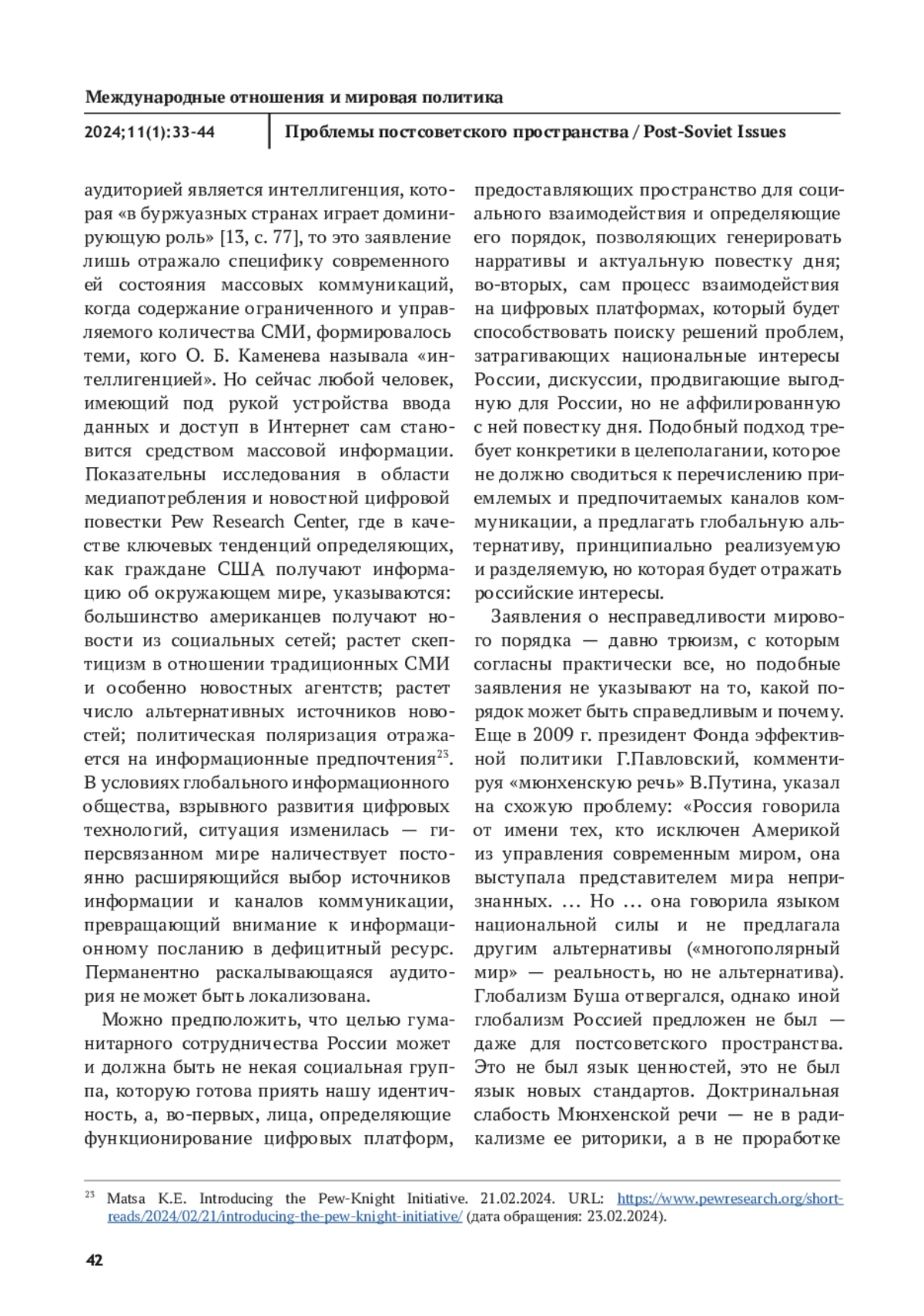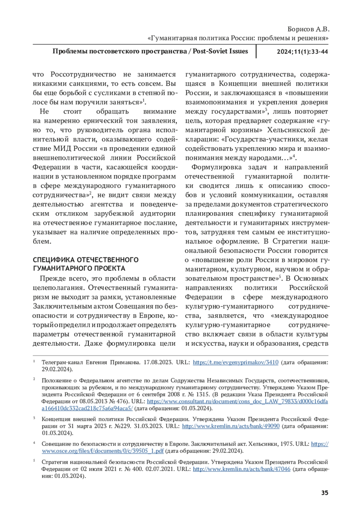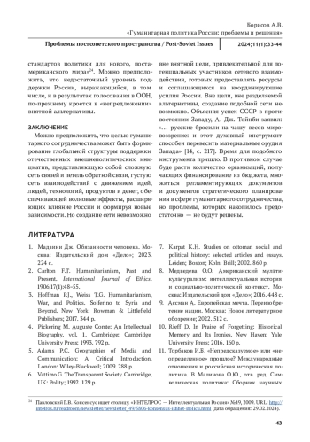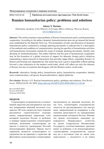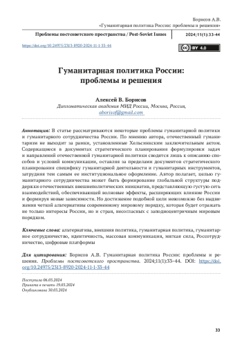 В статье рассматриваются некоторые проблемы гуманитарной политики и гуманитарного сотрудничества России. По мнению автора, отечественный гуманитаризм не выходит за рамки, установленные Хельсинкским заключительным актом. Содержащиеся в документах стратегического планирования формулировки задач и направлений отечественной гуманитарной политики сводятся лишь к описанию способов и условий коммуникации, оставляя за пределами документов стратегического планирования специфику гуманитарной деятельности и гуманитарных инструментов, затрудняя тем самым ее институциональное оформление. Автор полагает, целью гуманитарного сотрудничества может быть формирование глобальной структуры поддержки отечественных внешнеполитических инициатив, представляющую густую сеть взаимодействий, обеспечивающей волновые эффекты, расширяющих влияние России и формируя новые зависимости. Но достижение подобной цели невозможно без выдвижения четкой альтернативы современному мировому порядку, которая будет отражать не только интересы России, но и стран, несогласных с западноцентричным мировым порядком.