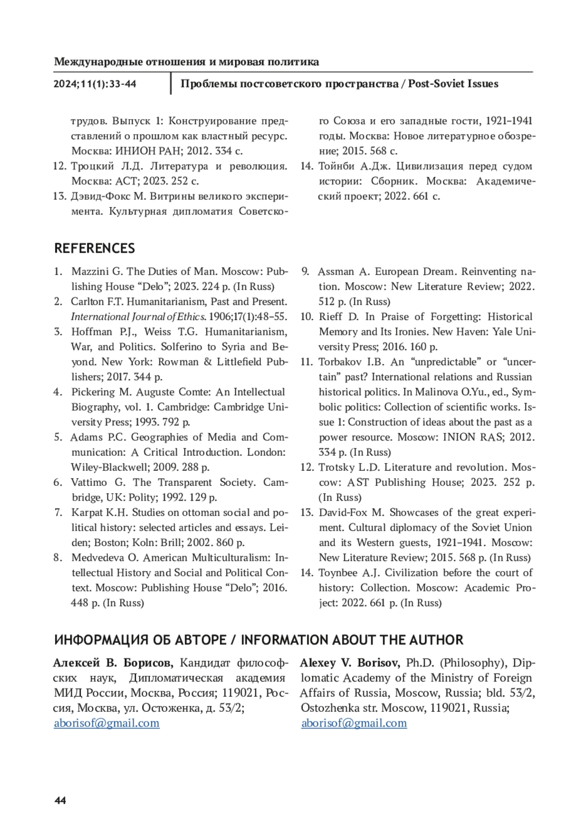 11. Торбаков И.Б. «Непредсказуемое» или «неопределенное» прошлое? Международные отношения и российская историческая политика. В Малинова О.Ю., отв. ред. Символическая политика: Сборник научных трудов. Выпуск 1: Конструирование представлений о прошлом как властный ресурс. Москва: ИНИОН РАН; 2012. 334 с.