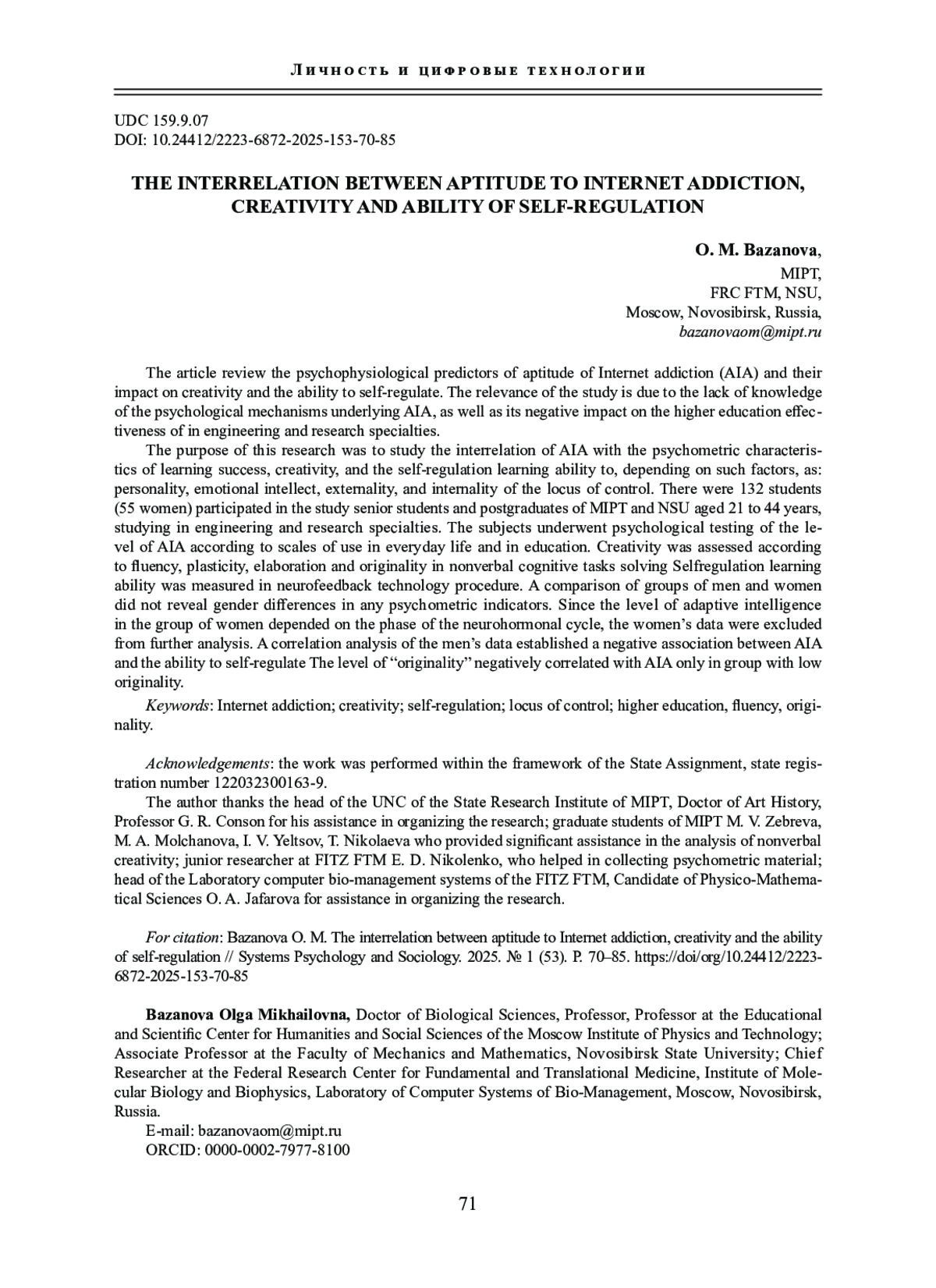 В статье рассматриваются психофизиологические предикторы склонности к интернет-зависимости (СИЗ) и их влияние на креативность и способность к саморегуляции. Актуальность исследования обусловлена недостаточной изученностью психологических механизмов, лежащих в основе СИЗ, а также ее негативным влиянием на эффективность обучения в высшей школе по инженерным и научно-исследовательским специальностям. Целью настоящего исследования было изучение взаимосвязи СИЗ с психометрическими характеристиками успешности обучения, креативности и способности к саморегуляции в зависимости от факторов личности, экстернальности и интернальности локуса контроля.