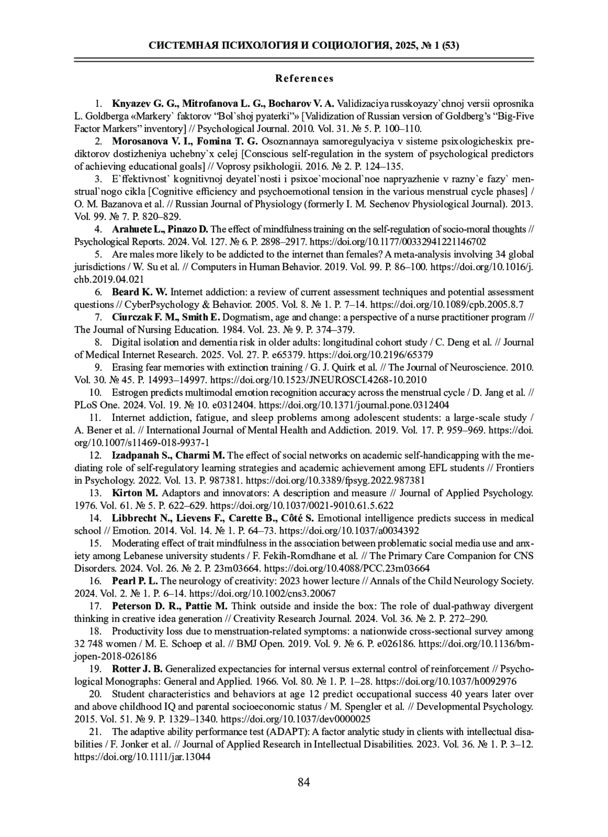 2. Моросанова В. И., Фомина Т. Г. Осознанная саморегуляция в системе психологических предиктор ов достижения учебных целей // Вопросы психологии. 2016. № 2. С. 124-135. EDN: WIALHV