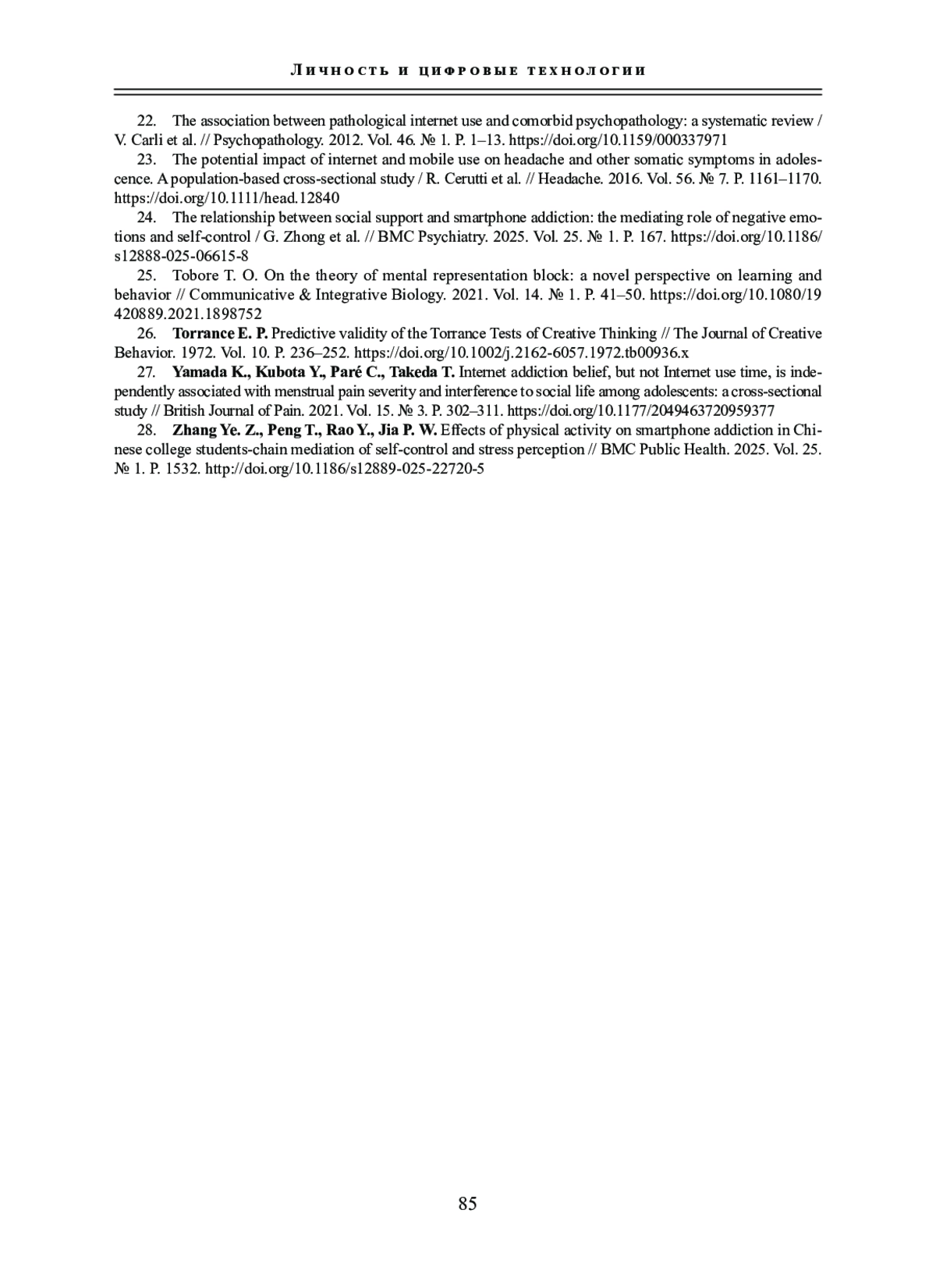 28. Zhang Ye. Z., Peng T., Rao Y., Jia P. W. Effects of physical activity on smartphone addiction in Chinese college students-chain mediation of self-control and stress perception // BMC Public Health. 2025. Vol. 25. № 1. P. 1532. DOI: 10.1186/s12889-025-22720-5