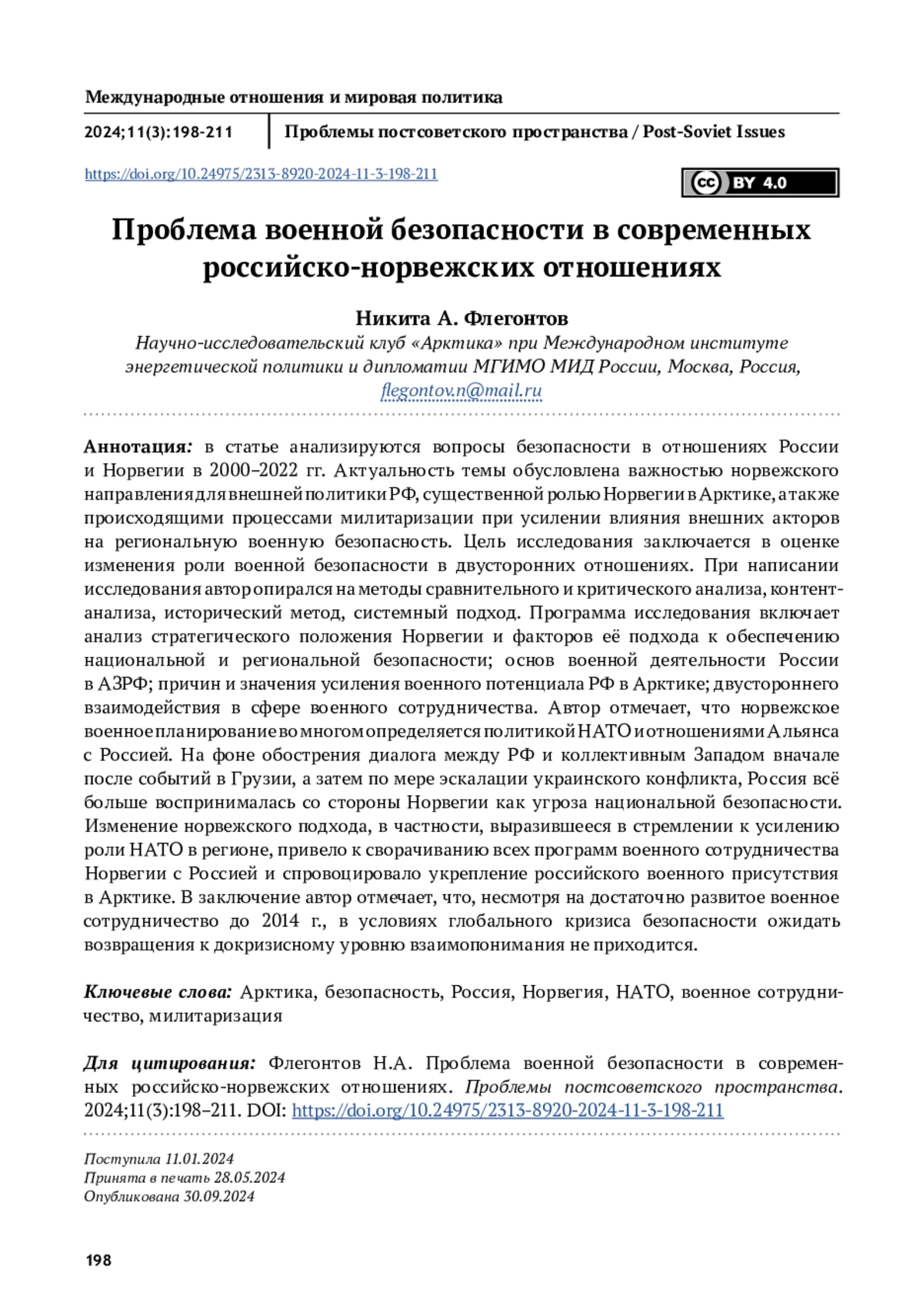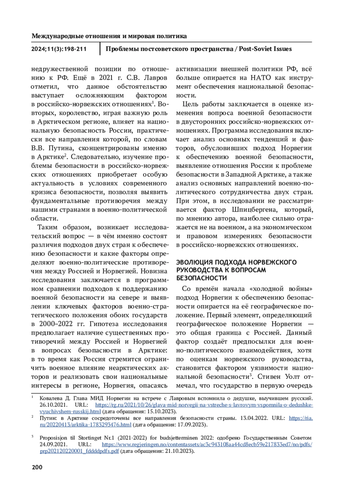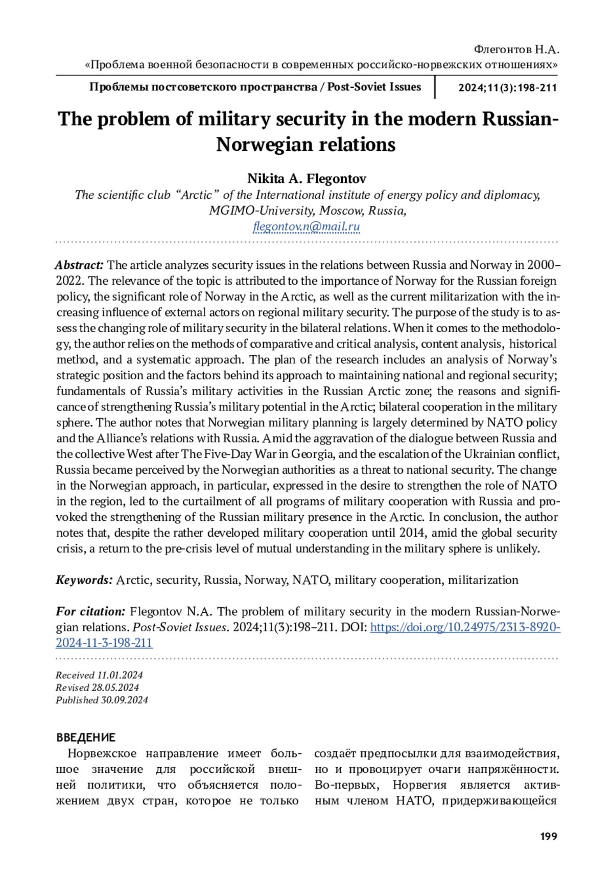 В статье анализируются вопросы безопасности в отношениях России и Норвегии в 2000–2022 гг. Актуальность темы обусловлена важностью норвежского направления для внешней политики РФ, существенной ролью Норвегии в Арктике, а также происходящими процессами милитаризации при усилении влияния внешних акторов на региональную военную безопасность. Цель исследования заключается в оценке изменения роли военной безопасности в двусторонних отношениях. При написании исследования автор опирался на методы сравнительного и критического анализа, контент-анализа, исторический метод, системный подход. Программа исследования включает анализ стратегического положения Норвегии и факторов её подхода к обеспечению национальной и региональной безопасности; основ военной деятельности России в АЗРФ; причин и значения усиления военного потенциала РФ в Арктике; двустороннего взаимодействия в сфере военного сотрудничества. Автор отмечает, что норвежское военное планирование во многом определяется политикой НАТО и отношениями Альянса с Россией. На фоне обострения диалога между РФ и коллективным Западом вначале после событий в Грузии, а затем по мере эскалации украинского конфликта, Россия всё больше воспринималась со стороны Норвегии как угроза национальной безопасности. Изменение норвежского подхода, в частности, выразившееся в стремлении к усилению роли НАТО в регионе, привело к сворачиванию всех программ военного сотрудничества Норвегии с Россией и спровоцировало укрепление российского военного присутствия в Арктике. В заключение автор отмечает, что, несмотря на достаточно развитое военное сотрудничество до 2014 г., в условиях глобального кризиса безопасности ожидать возвращения к докризисному уровню взаимопонимания не приходится.