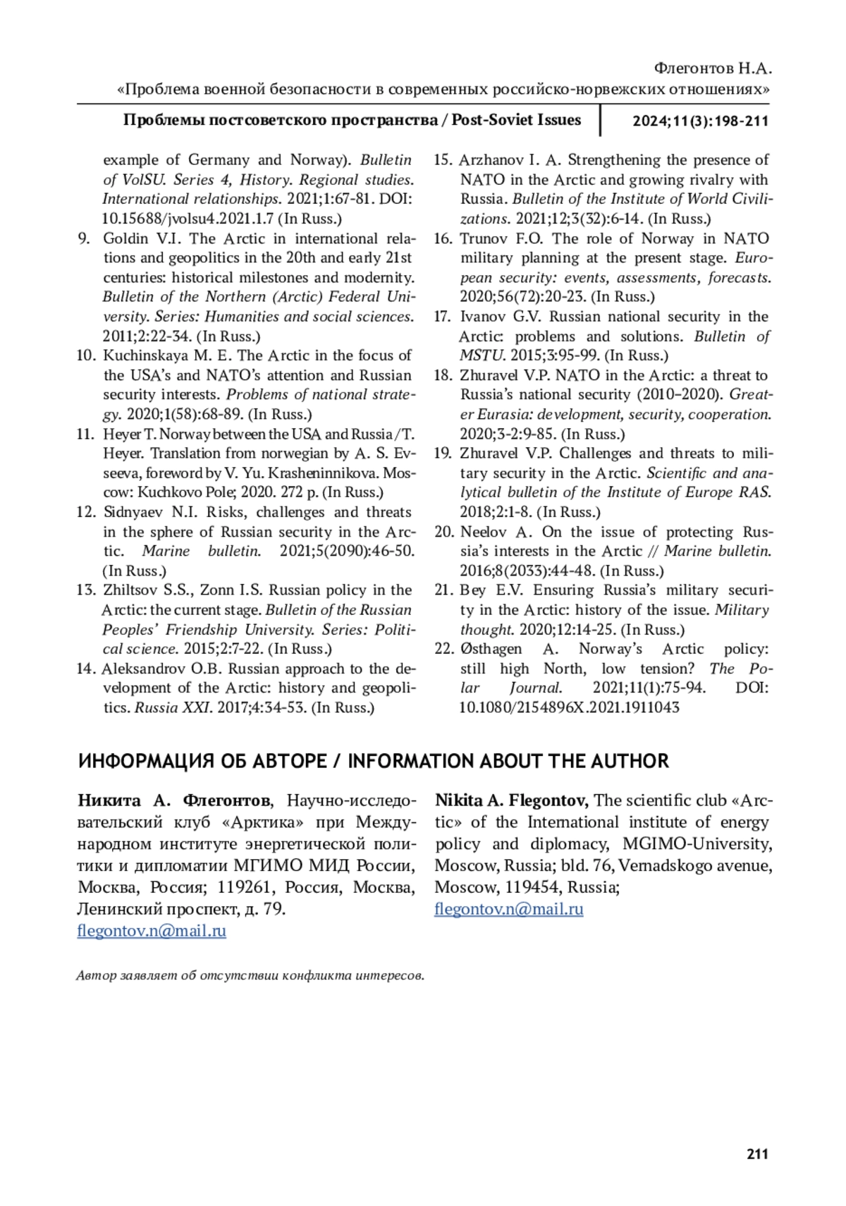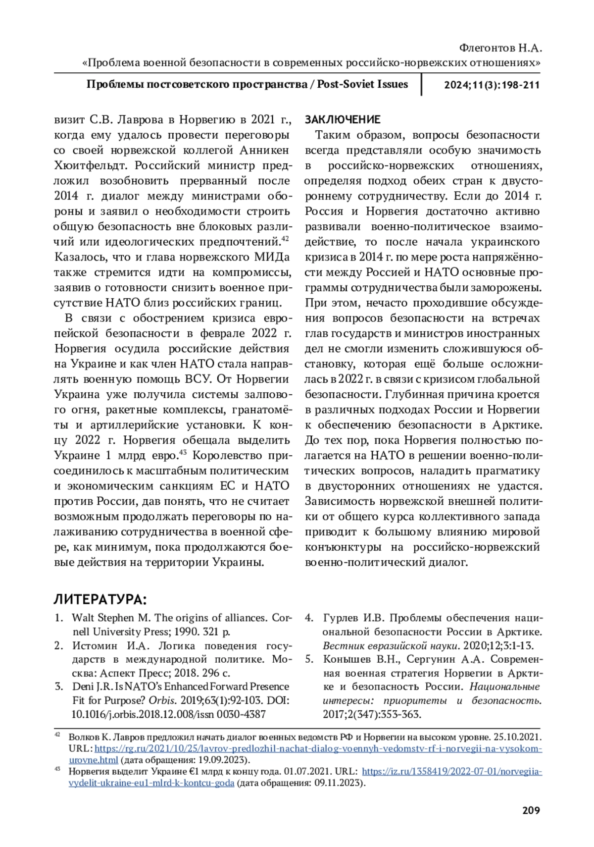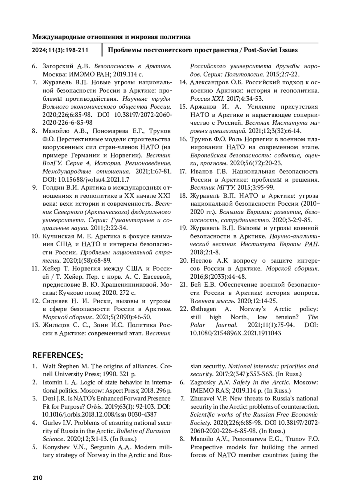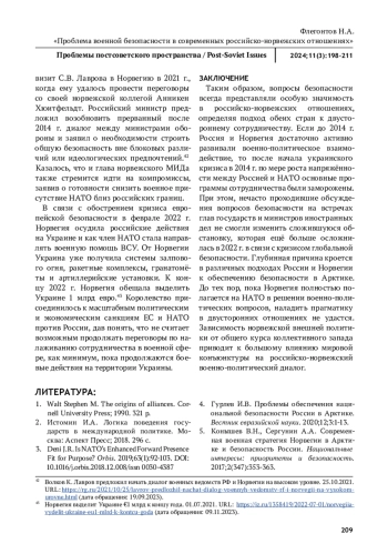 В статье анализируются вопросы безопасности в отношениях России и Норвегии в 2000–2022 гг. Актуальность темы обусловлена важностью норвежского направления для внешней политики РФ, существенной ролью Норвегии в Арктике, а также происходящими процессами милитаризации при усилении влияния внешних акторов на региональную военную безопасность. Цель исследования заключается в оценке изменения роли военной безопасности в двусторонних отношениях. При написании исследования автор опирался на методы сравнительного и критического анализа, контент-анализа, исторический метод, системный подход. Программа исследования включает анализ стратегического положения Норвегии и факторов её подхода к обеспечению национальной и региональной безопасности; основ военной деятельности России в АЗРФ; причин и значения усиления военного потенциала РФ в Арктике; двустороннего взаимодействия в сфере военного сотрудничества. Автор отмечает, что норвежское военное планирование во многом определяется политикой НАТО и отношениями Альянса с Россией. На фоне обострения диалога между РФ и коллективным Западом вначале после событий в Грузии, а затем по мере эскалации украинского конфликта, Россия всё больше воспринималась со стороны Норвегии как угроза национальной безопасности. Изменение норвежского подхода, в частности, выразившееся в стремлении к усилению роли НАТО в регионе, привело к сворачиванию всех программ военного сотрудничества Норвегии с Россией и спровоцировало укрепление российского военного присутствия в Арктике. В заключение автор отмечает, что, несмотря на достаточно развитое военное сотрудничество до 2014 г., в условиях глобального кризиса безопасности ожидать возвращения к докризисному уровню взаимопонимания не приходится.