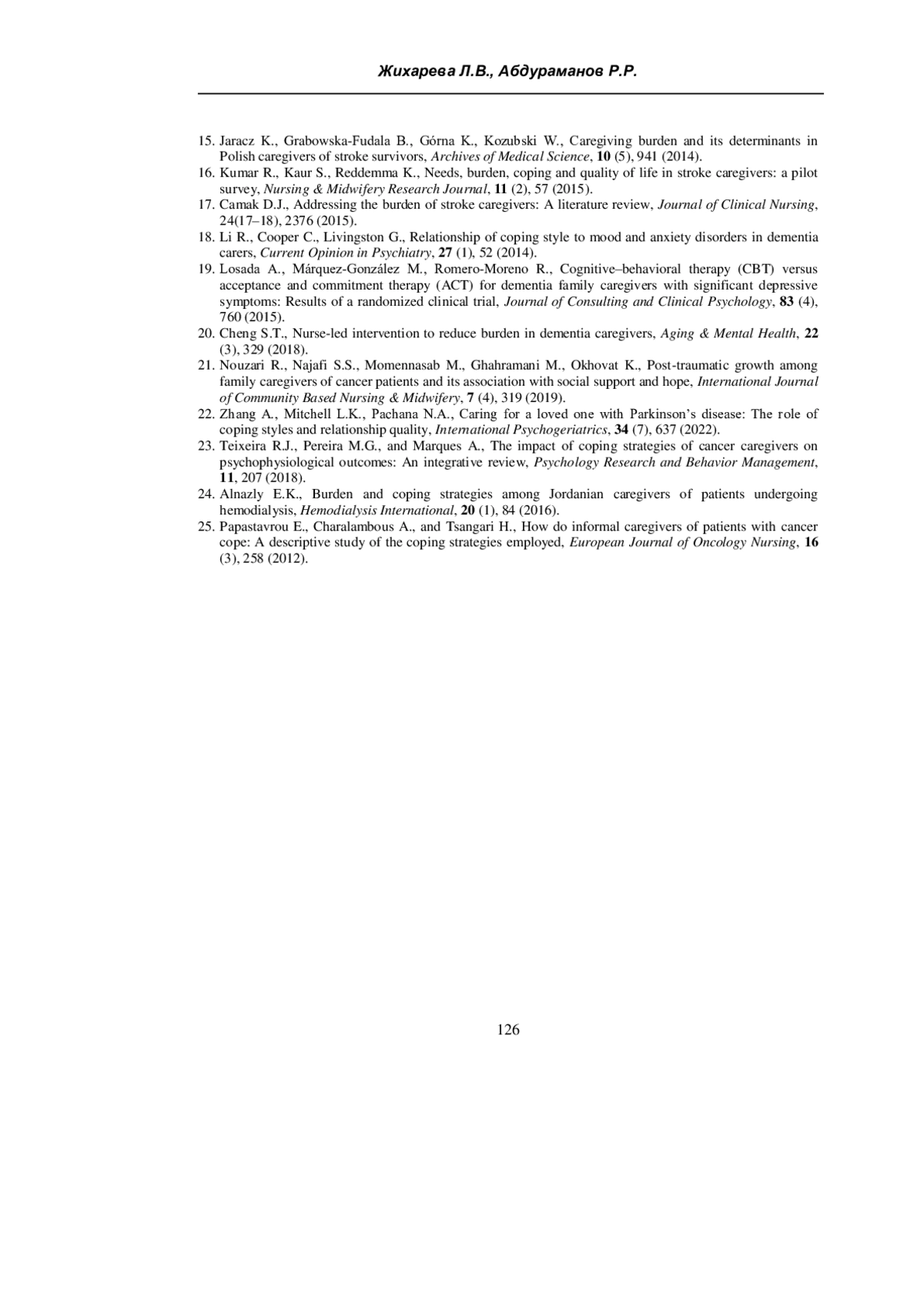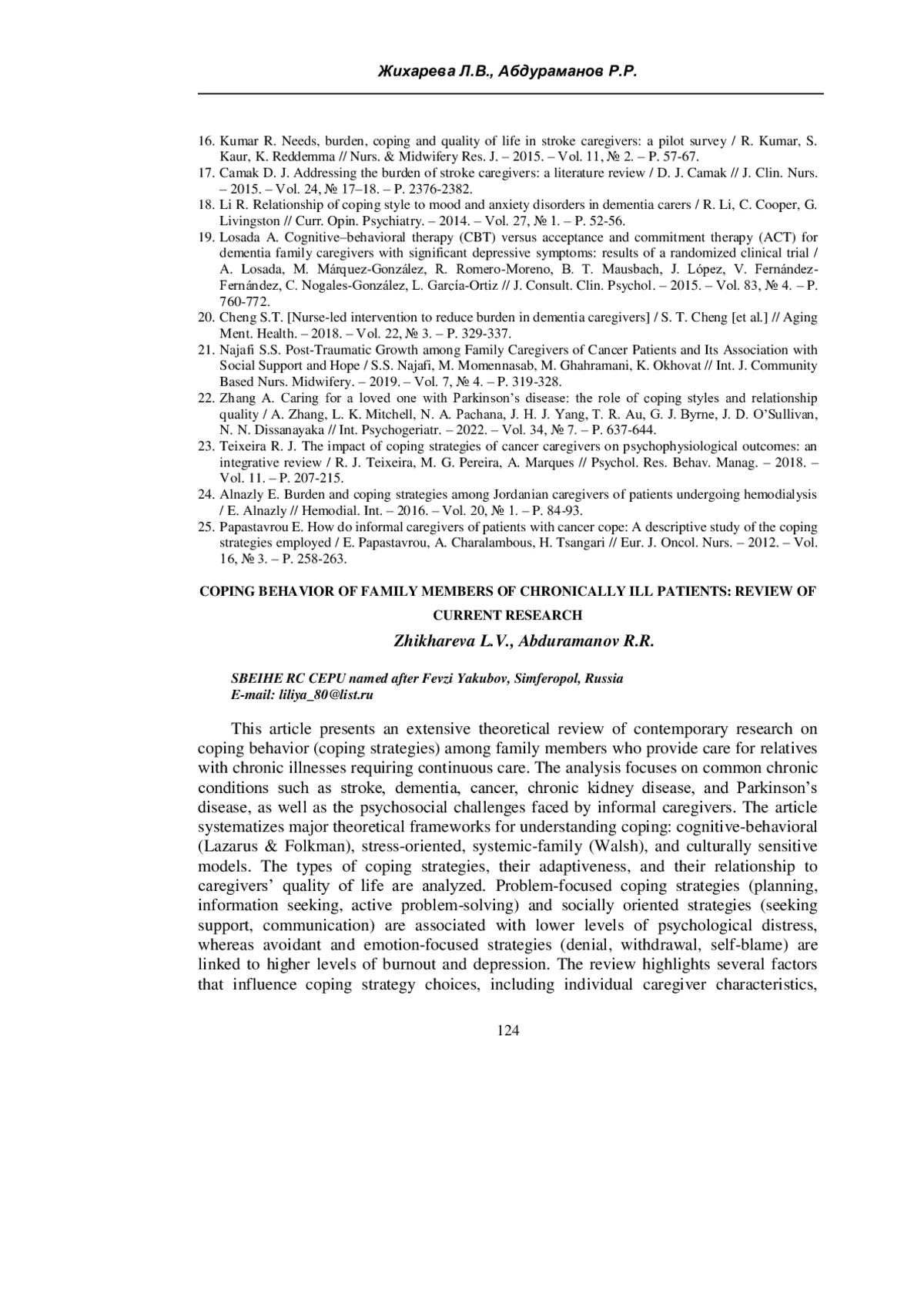 ЖИХАРЕВА Л. В., АБДУРАМАНОВ Р. Р. СОВЛАДАЮЩЕЕ ПОВЕДЕНИЕ ЧЛЕНОВ СЕМЕЙ ХРОНИЧЕСКИ БОЛЬНЫХ ПАЦИЕНТОВ: ОБЗОР СОВРЕМЕННЫХ ИССЛЕДОВАНИЙ // УЧЕНЫЕ ЗАПИСКИ КРЫМСКОГО ФЕДЕРАЛЬНОГО УНИВЕРСИТЕТА ИМЕНИ В. И. ВЕРНАДСКОГО. СОЦИОЛОГИЯ. ПЕДАГОГИКА. ПСИХОЛОГИЯ. 2025. ТОМ 11 (77). № 3