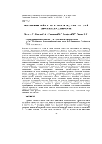 Фенотип рассматривается в статье в самом широком смысле как совокупность всех свойств и признаков, образовавшихся в процессе индивидуального развития, в том числе психологических. В содержательном плане влияние морфологических, физиологических, соматических, психологических и поведенческих компонентов фенотипа на те или иные процессы и феномены бытия конкретной личности или социальной группы (как реальной или условной общности), различна. В исследовании факторов, влияющих на инициацию табакокурения среди студентов, проживающих в европейской части России, выявлены взаимосвязи между показателями их соматического, функционального, психологического и поведенческого статуса. Сравнительная оценка выраженности этих показателей позволила констатировать комплексный характер мотивационной составляющей инициации курения в среде студенческой молодежи и обосновать целесообразность дальнейшего поиска системных взаимосвязей факторов развития табачной зависимости. Подтверждены общепринятые представления о связи с табачной зависимостью таких показателей, как депрессивность, алкоголизация, поведенческая агрессия, агрессивность спонтанная, раздражительность, фрустрация, экзальтированность, демонстративность, открытость и социальная активность. Гендерные различия в группах курящих не выявлены. В группах малокурящих обнаружены гендерные различия: максимальный уровень индекса массы тела, потребления наркотиков и авантюрности у мужчин и высокий уровень проявления суицидальных идеаций, невротичности, реактивной агрессивности, возбудимости у женщин. Интерпретация других полученных данных предполагает проведения уточняющих исследований, например, бессонница, как симптом функциональной дезадаптации и социальная деструктивность, как индикатор социальной дезадаптации наблюдается в группах малокурящих и минимально выражен в группах некурящих, независимо от гендерной принадлежности. Полученные результаты расширяют представления о системном формировании табачной зависимости и вносят новые элементы в персонализацию профилактики курения в среде студенческой молодежи.