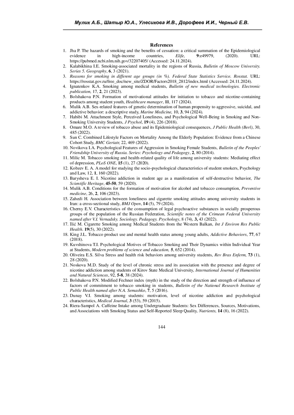 25. Мулик А.Б. Особенности свойств личности у курящих студентов - жителей северных территорий России / А.Б. Мулик, Ю.А. Шатыр, И.В. Улесикова, А.Г. Соловьев, Н.О. Назаров, Е.В. Чёрный // Экология человека. - 2022. - № 9. - С. 663-671. EDN: ECFVPD