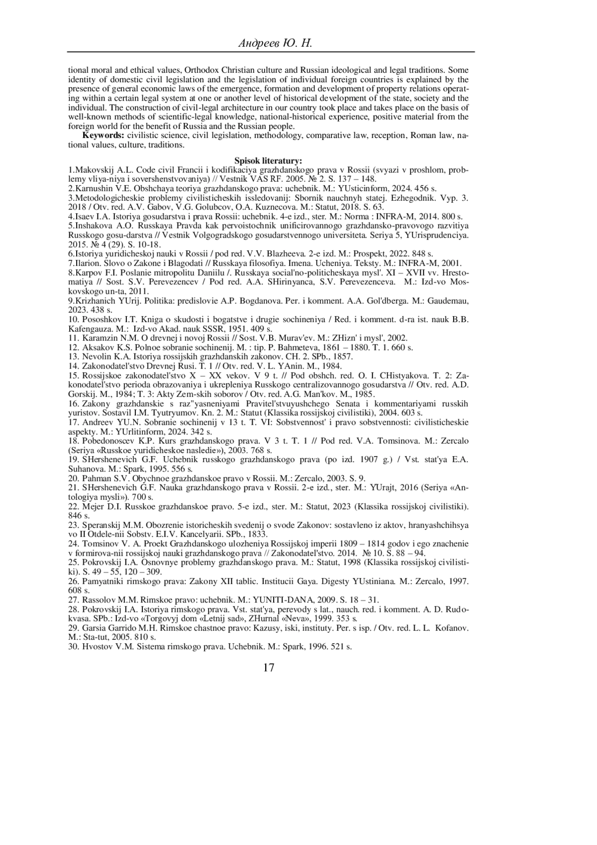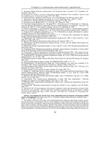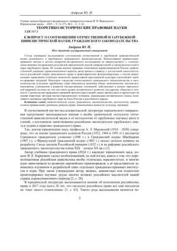 АНДРЕЕВ Ю. Н. К ВОПРОСУ О СООТНОШЕНИИ ОТЕЧЕСТВЕННОЙ И ЗАРУБЕЖНОЙ ЦИВИЛИСТИЧЕСКОЙ НАУКИ, ГРАЖДАНСКОГО ЗАКОНОДАТЕЛЬСТВА // УЧЕНЫЕ ЗАПИСКИ КРЫМСКОГО ФЕДЕРАЛЬНОГО УНИВЕРСИТЕТА ИМЕНИ В. И. ВЕРНАДСКОГО. ЮРИДИЧЕСКИЕ НАУКИ. 2025. ТОМ 11. №2