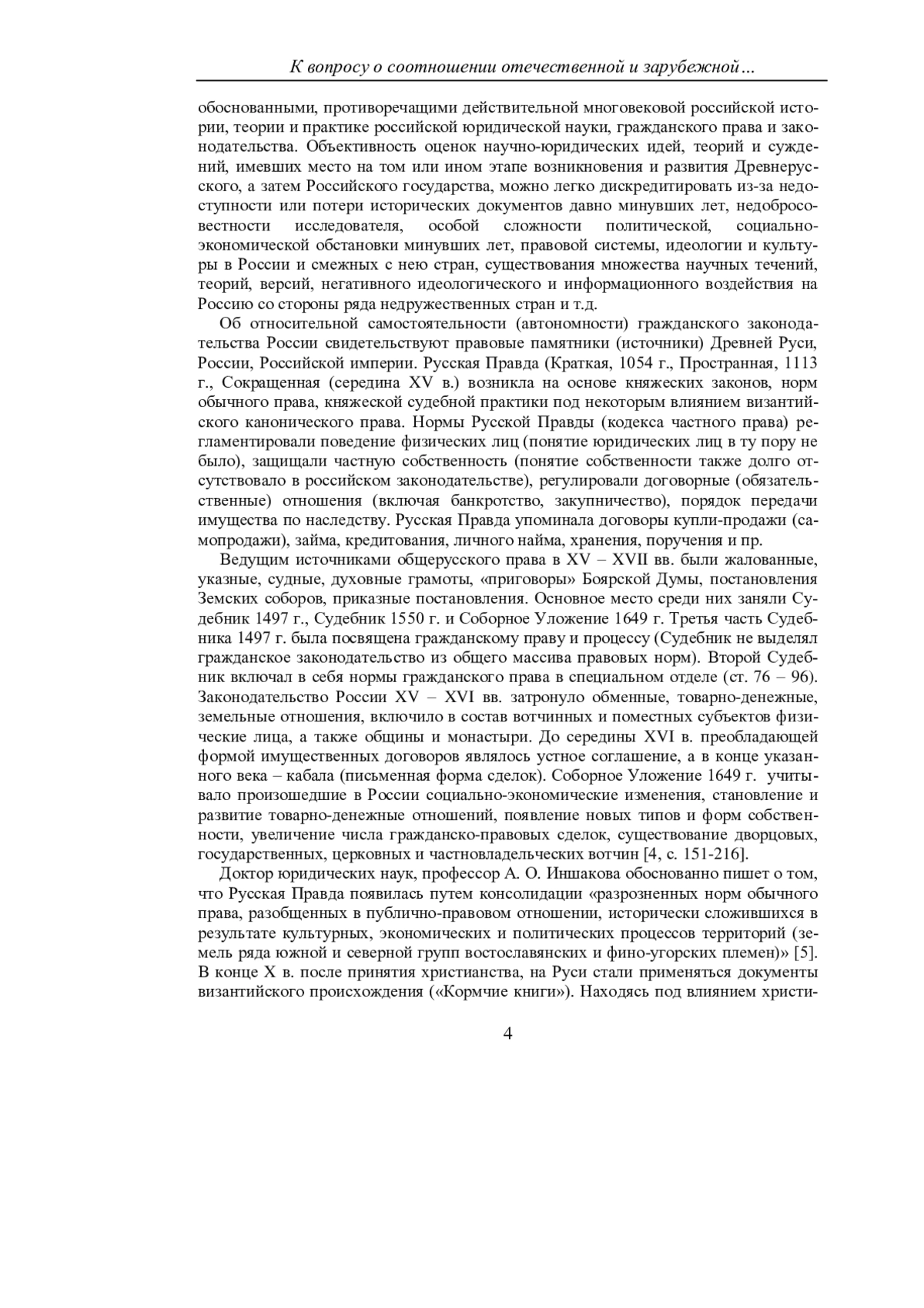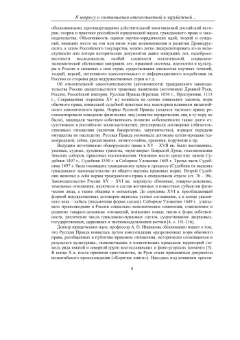 Статья посвящена исследованию соотношения отечественной и зарубежной цивилистической науки, российского и зарубежного гражданского законодательства. Использование сравнительно-правового метода и метода конкретно-исторического исследования не свидетельствует о «слепом» заимствовании (подражании) российской юридической наукой (цивилистикой) и законодателем идей и норм зарубежного права. На основе анализа правовых памятников дореволюционной России, цивилистической доктрины дореволюционного периода автор пришел к выводу о достаточной самостоятельности российской теории гражданского права и правотворчества, функционируемых с учетом национальных нравственно-этических ценностей, православной христианской культуры и российских идейно-правовых традиций. Некоторое тождество отечественного гражданского законодательства и законодательства отдельных зарубежных стран объясняется наличием общих экономических законов возникновения, становления и развития имущественных отношений, действующих в рамках определенной правовой системы на том или ином уровне исторического развития государства, общества и личности. Строительство гражданско-правовой архитектуры в нашей стране происходило и происходит на основе известных методов научно-юридического познания, национально-исторического опыта, позитивного материала зарубежного мира на благо России и российского народа.