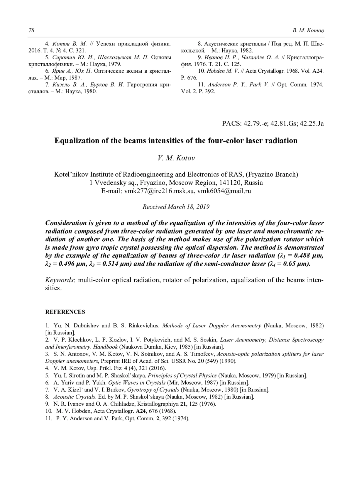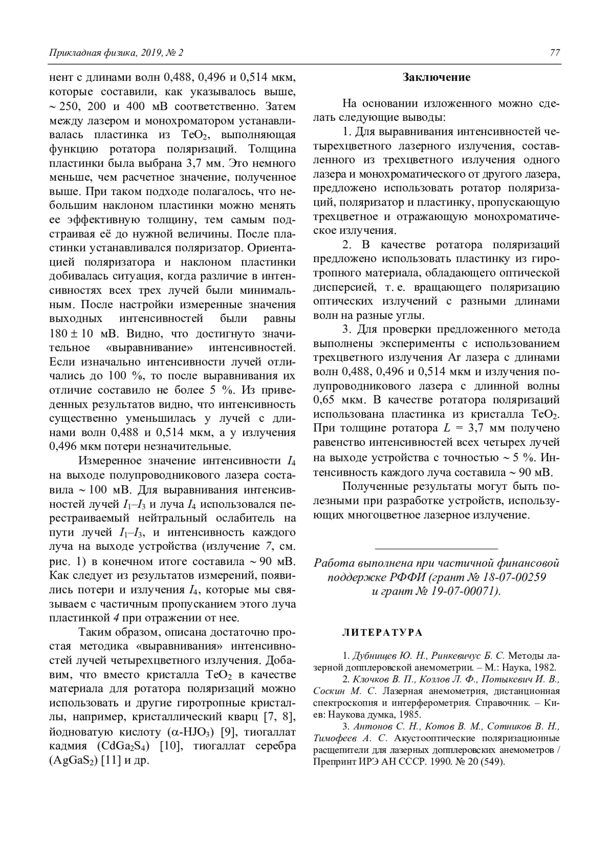 КОТОВ В. М. ВЫРАВНИВАНИЕ ИНТЕНСИВНОСТЕЙ ЛУЧЕЙ ЧЕТЫРЕХЦВЕТНОГО ЛАЗЕРНОГО ИЗЛУЧЕНИЯ // ПРИКЛАДНАЯ ФИЗИКА. 2019. №2
