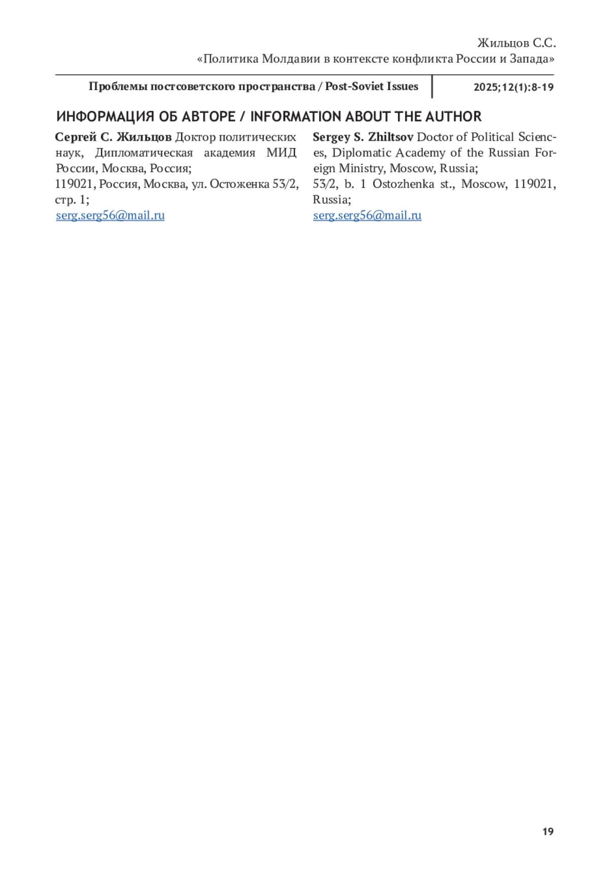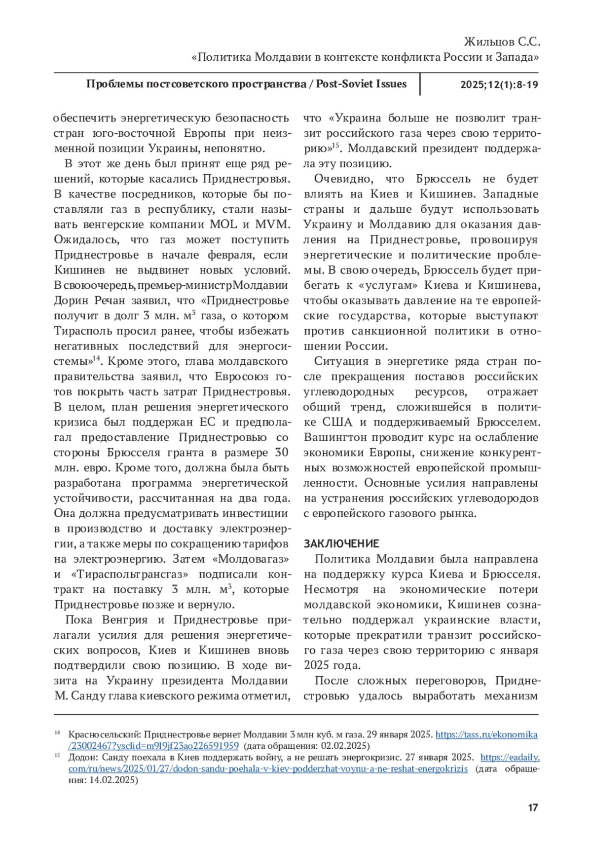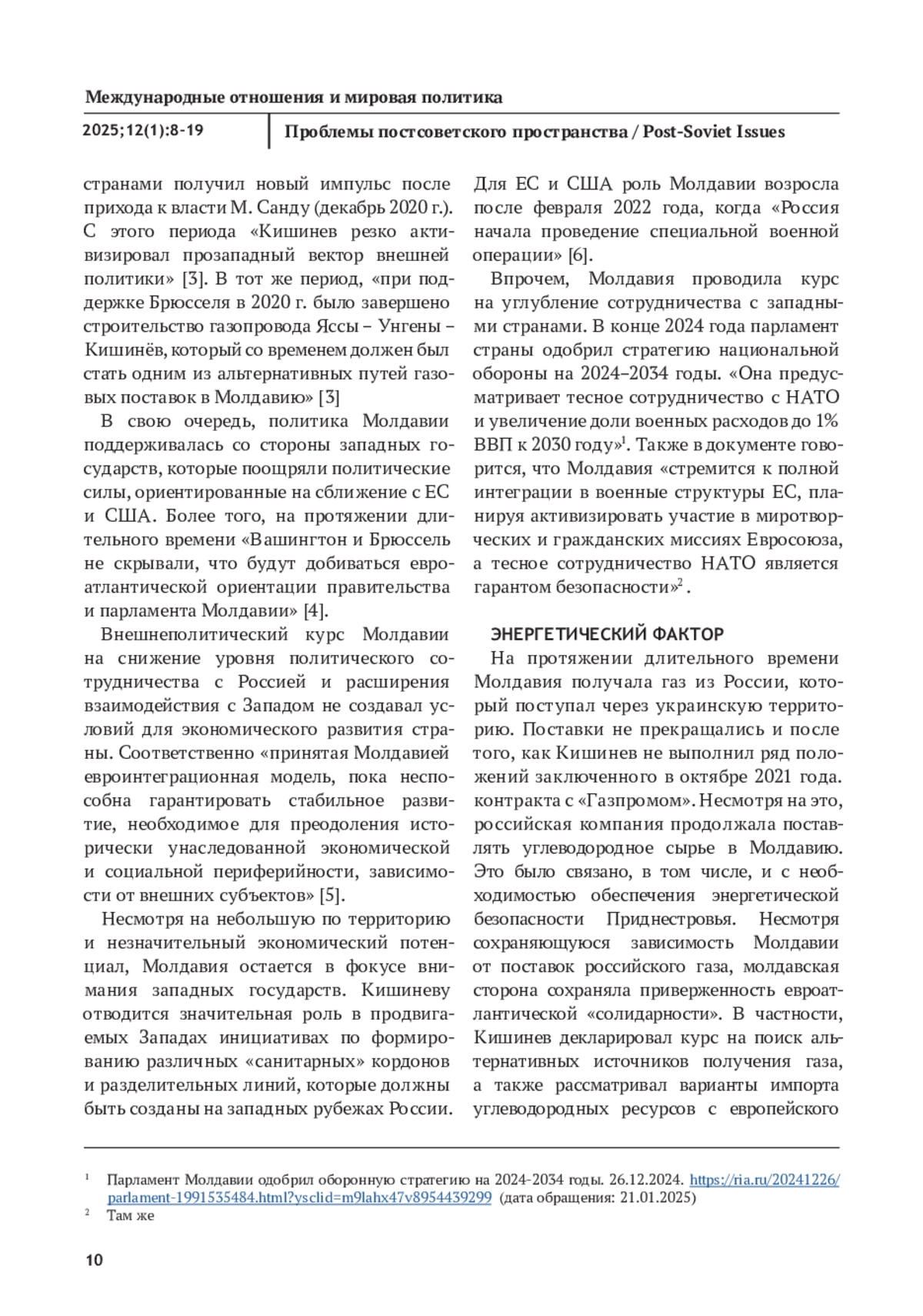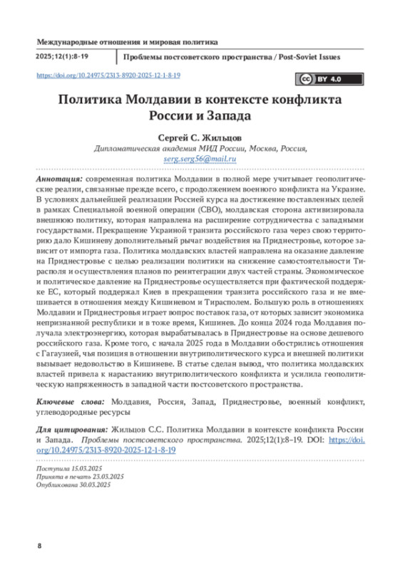 Современная политика Молдавии в полной мере учитывает геополитические реалии, связанные прежде всего, с продолжением военного конфликта на Украине. В условиях дальнейшей реализации Россией курса на достижение поставленных целей в рамках Специальной военной операции (СВО), молдавская сторона активизировала внешнюю политику, которая направлена на расширение сотрудничества с западными государствами. Прекращение Украиной транзита российского газа через свою территорию дало Кишиневу дополнительный рычаг воздействия на Приднестровье, которое зависит от импорта газа. Политика молдавских властей направлена на оказание давление на Приднестровье с целью реализации политики на снижение самостоятельности Тирасполя и осуществления планов по реинтеграции двух частей страны. Экономическое и политическое давление на Приднестровье осуществляется при фактической поддержке ЕС, который поддержал Киев в прекращении транзита российского газа и не вмешивается в отношения между Кишиневом и Тирасполем. Большую роль в отношениях Молдавии и Приднестровья играет вопрос поставок газа, от которых зависит экономика непризнанной республики и в тоже время, Кишинев. До конца 2024 года Молдавия получала электроэнергию, которая вырабатывалась в Приднестровье на основе дешевого российского газа. Кроме того, с начала 2025 года в Молдавии обострились отношения с Гагаузией, чья позиция в отношении внутриполитического курса и внешней политики вызывает недовольство в Кишиневе. В статье сделан вывод, что политика молдавских властей привела к нарастанию внутриполитического конфликта и усилила геополитическую напряженность в западной части постсоветского пространства.