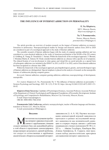 Многолетние исследования проблемы интернет-зависимости российскими и зарубежными учеными создали значимую базу для дальнейшей работы в этой области и продолжают демонстрировать возрастающую актуальность данной проблемы, что следует из отечественных и зарубежных аналитических обзоров исследований интернет- зависимости [1; 4; 9; 10].