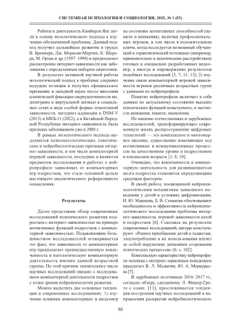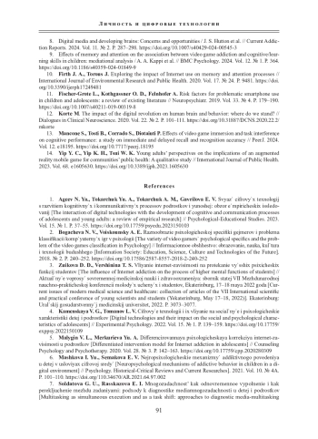 1. Агеев Н. Я., Токарчук Ю. А., Токарчук А. М., Гаврилова Е. В. Связь цифровых технологий с развитием когнитивных и коммуникативных процессов подростков и юношей: обзор эмпирических исследований // Психолого-педагогические исследования. 2023. Т. 15. № 1. С. 37-55. DOI: 10.17759/psyedu.2023150103 EDN: DYSELX