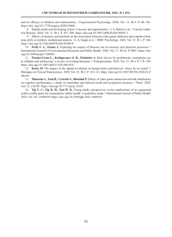 9. Effects of memory and attention on the association between video game addiction and cognitive/learning skills in children: mediational analysis / A. A. Kappi et al. // BMC Psychology. 2024. Vol. 12. № 1. P. 364. DOI: 10.1186/s40359-024-01849-9 EDN: JNRARB
