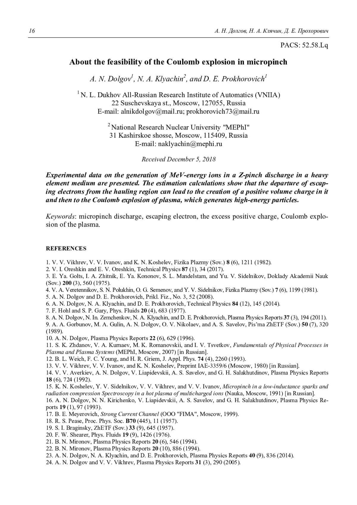 23. Долгов А. Н., Клячин Н. А., Прохорович Д. Е. // Физика плазмы. 2014. Т. 40. № 9. С. 836.