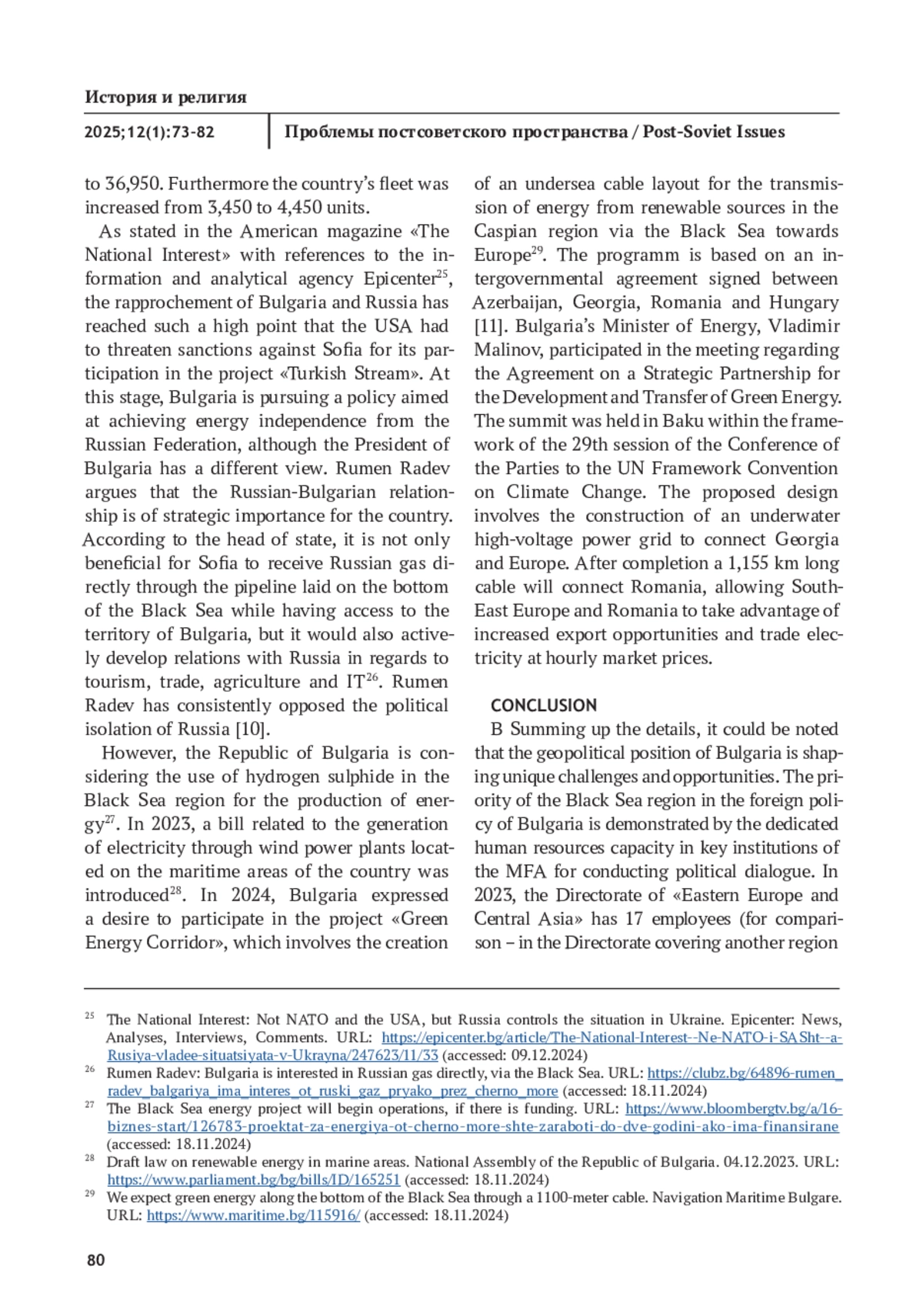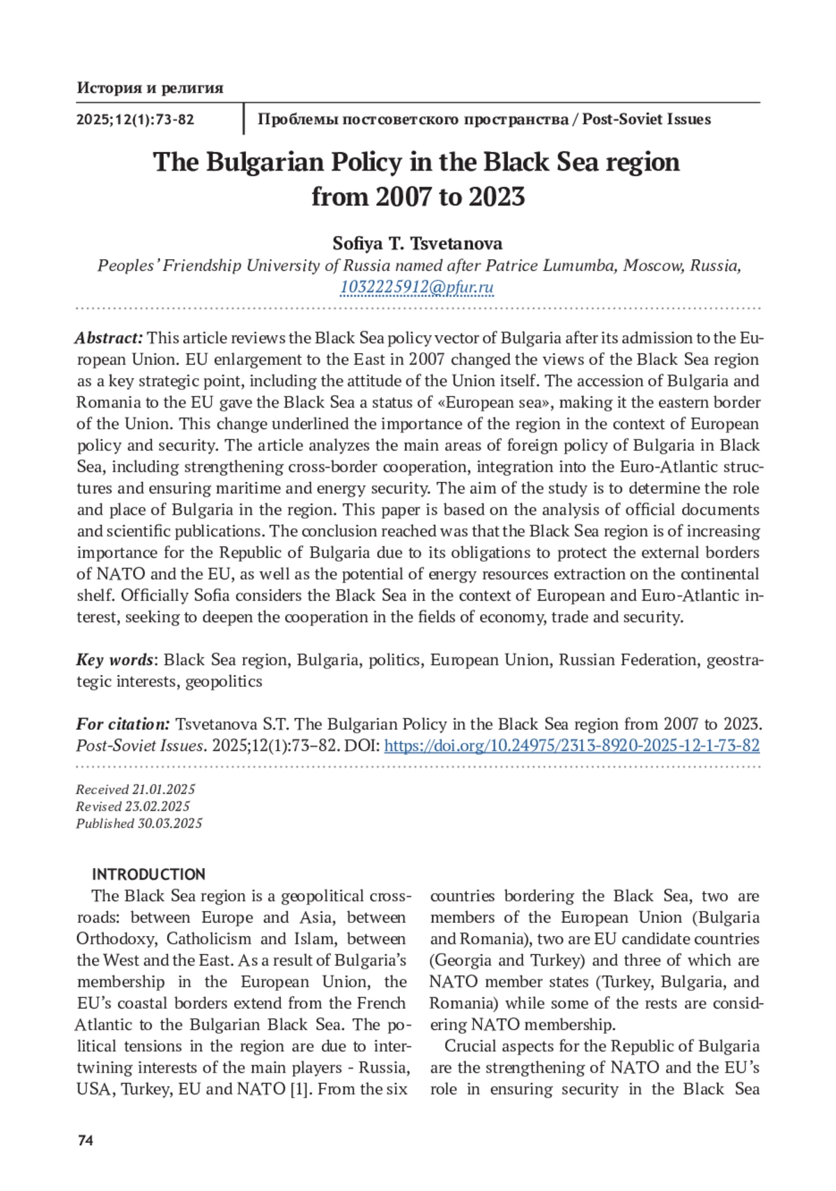 В данной статье рассматривается черноморский вектор политики Болгарии после вступления страны в Европейский союз. Расширение ЕС на Восток в 2007 году изменило восприятие Черноморского региона как ключевого стратегического пространства, включая отношение самого Союза. Принятие Болгарии и Румынии в ЕС придало Черному морю статус «европейского моря», превратив его в восточную границу Союза. Это изменение подчеркнуло значимость региона в контексте европейской политики и безопасности. В статье анализируются основные направления внешней политики Болгарии в Черноморье, включая укрепление трансграничного сотрудничества, интеграцию в евроатлантические структуры и обеспечение морской и энергетической безопасности. Цель исследования заключается в определении роли и места Болгарии в регионе. Работа основана на анализе официальных документов и научных публикаций. В заключении делается вывод о возрастающей значимости Черноморского региона для Республики Болгария ввиду ее обязательств по защите внешних границ НАТО и ЕС, а также потенциала добычи энергетических ресурсов на континентальном шельфе. Официальная София рассматривает Черноморье в европейском и евроатлантическом контексте, стремясь углублять сотрудничество в области экономики, торговли и безопасности.