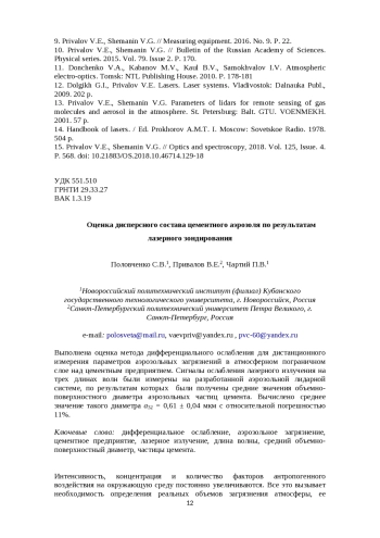 Ключевые фразы: дифференциальное ослабление, аэрозольное загрязнение, цементное предприятие, лазерное излучение, длина волны, средний объемно- поверхностный диаметр, частицы цемента