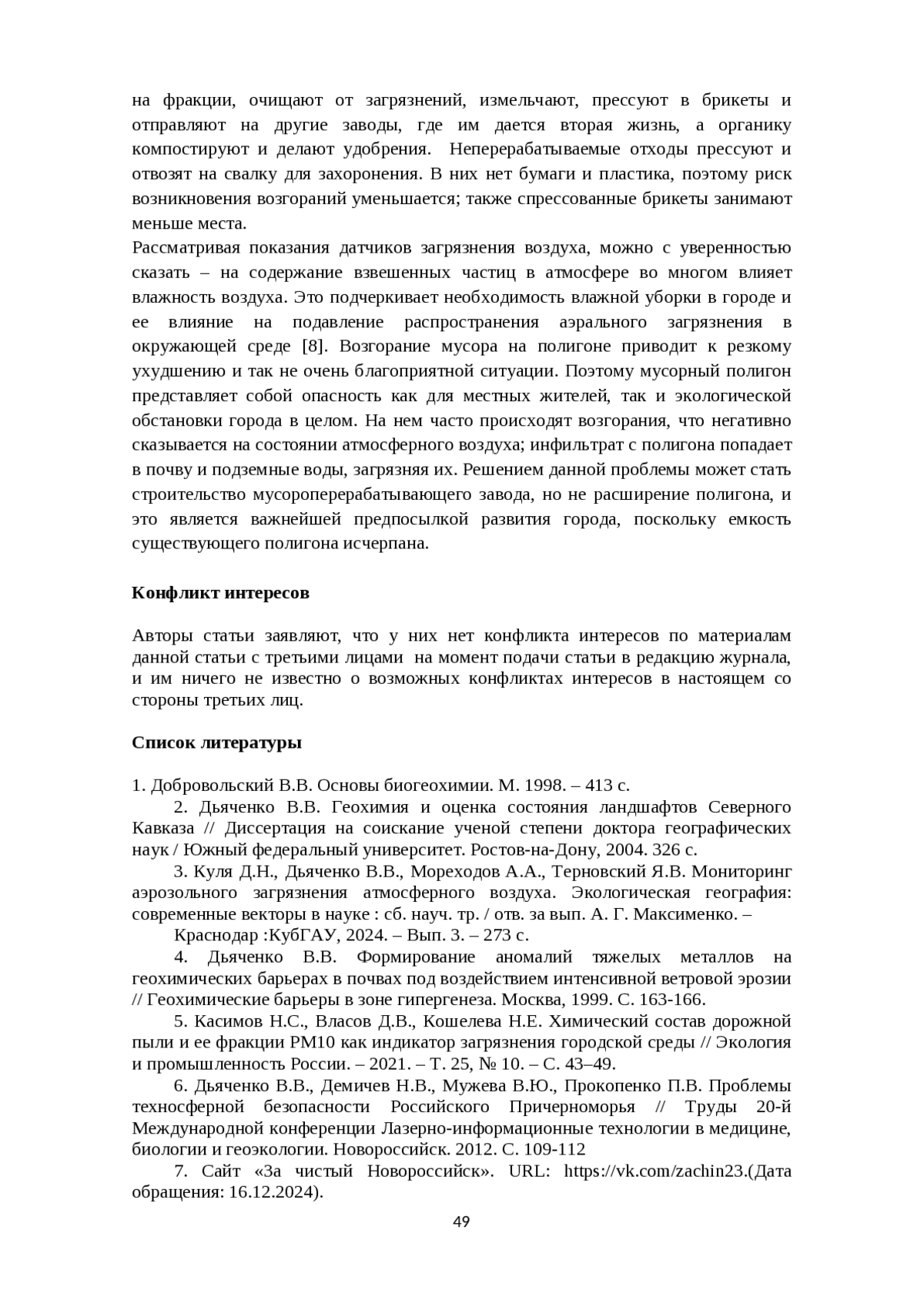 9. Дьяченко В.В., Шеманин В.Г., Вишневецкая В.В. Влияние техногенеза и геохимии аэрозолей на состояние окружающей среды и здоровье населения Юга России // География и природные ресурсы. - 2023. - Т. 44, № 4. - С. 46-58. DOI: 10.15372/GIPR20230405 EDN: OTMZCW