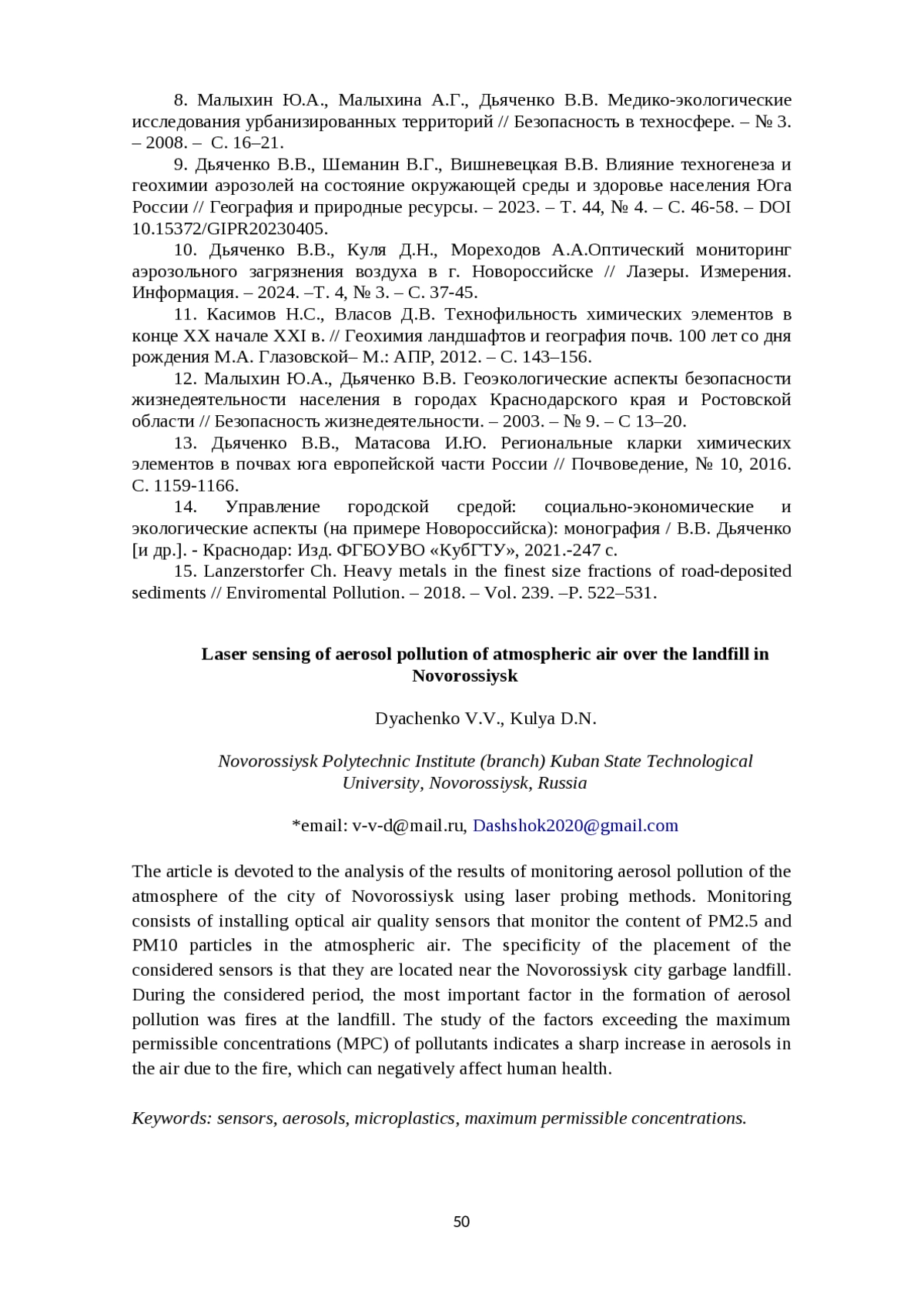 10. Дьяченко В.В., Куля Д.Н., Мореходов А.А.Оптический мониторинг аэрозольного загрязнения воздуха в г. Новороссийске // Лазеры. Измерения. Информация. - 2024. -Т. 4, № 3. - С. 37-45. EDN: KETMSN