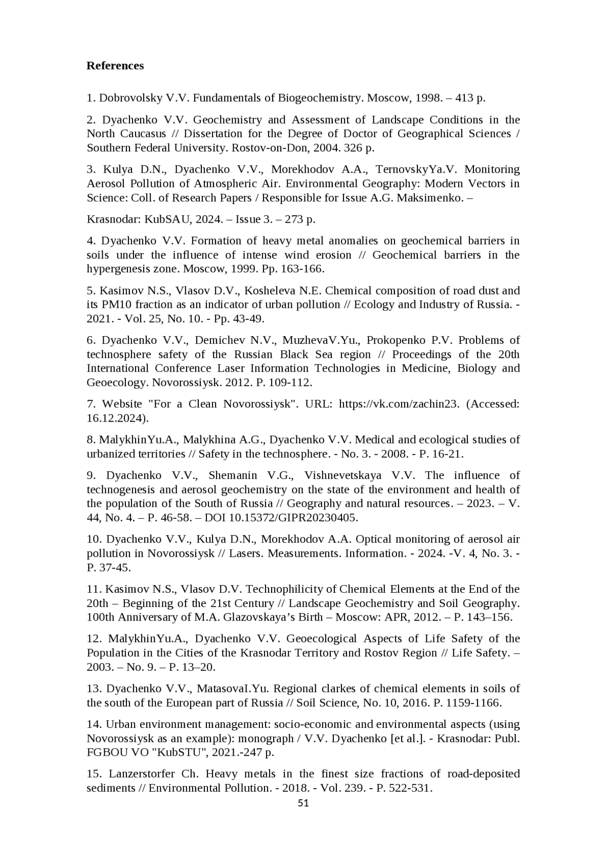 2. Дьяченко В.В. Геохимия и оценка состояния ландшафтов Северного Кавказа // Диссертация на соискание ученой степени доктора географических наук / Южный федеральный университет. Ростов-на-Дону, 2004. 326 с.