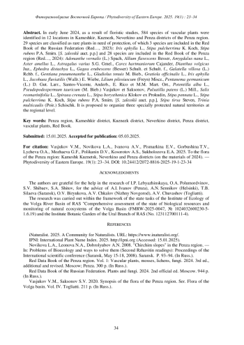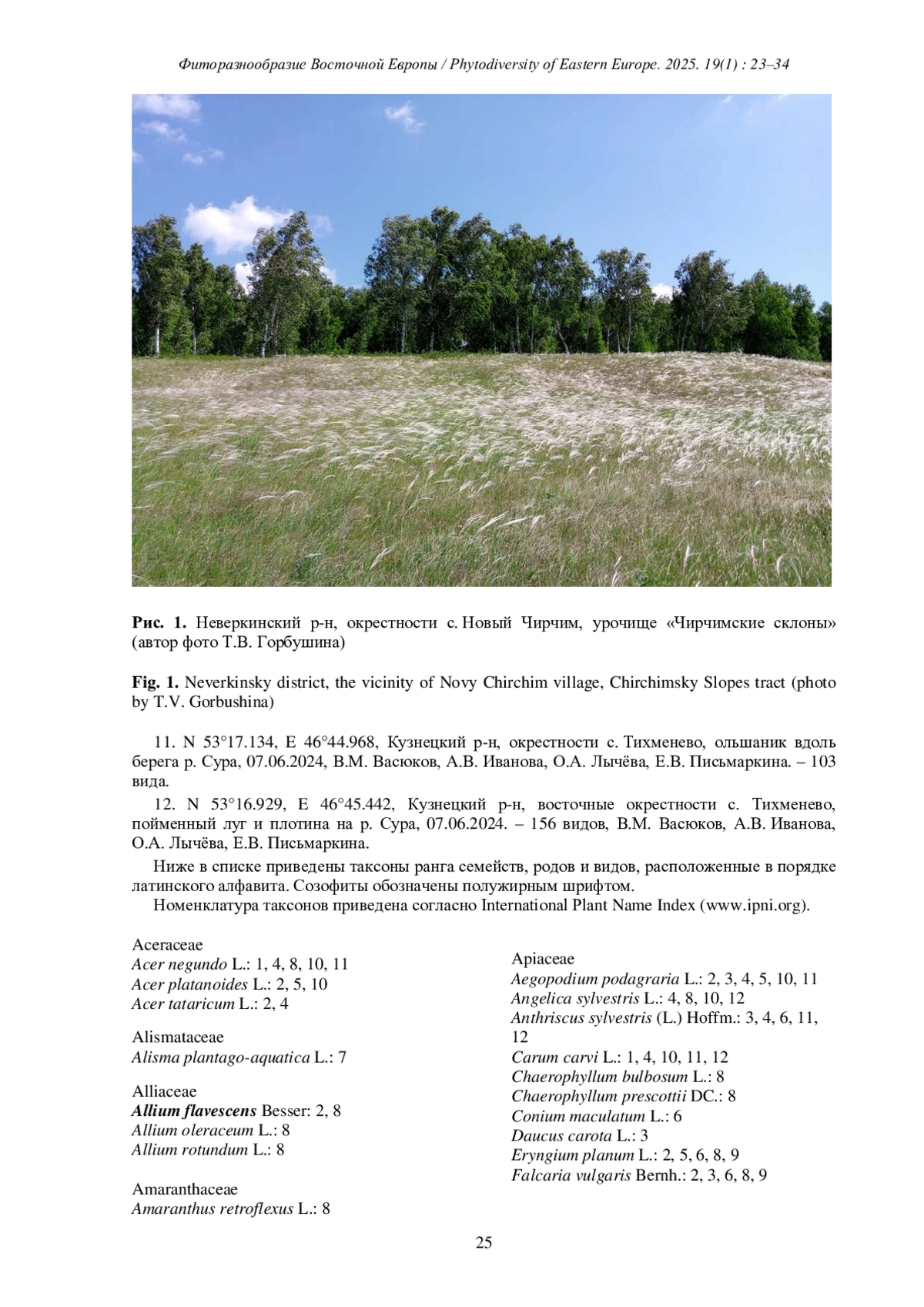 ВАСЮКОВ В. М., НОВИКОВА Л. А., ИВАНОВА А. В., ПИСЬМАРКИНА Е. В., ГОРБУШИНА Т. В., ЛЫЧЁВА О.А., МОЖАЕВА Г.Ф., ПОЛИКАНИН Д.В., КОСОРОТОВ А.С., СУХОЛОЗОВА Е.А. К ФЛОРЕ ПЕНЗЕНСКОЙ ОБЛАСТИ: КАМЕШКИРСКИЙ, КУЗНЕЦКИЙ, НЕВЕРКИНСКИЙ И ПЕНЗЕНСКИЙ РАЙОНЫ (ПО МАТЕРИАЛАМ 2024 ГОДА) // ФИТОРАЗНООБРАЗИЕ ВОСТОЧНОЙ ЕВРОПЫ. 2025. Т. 19 № 1 (17 СТ.)