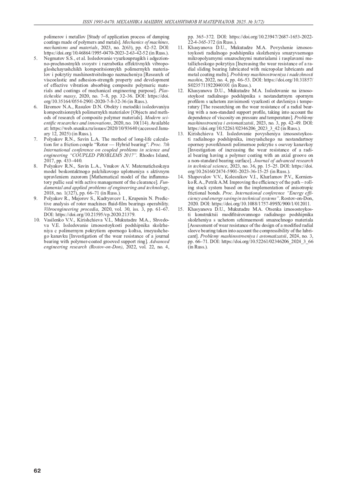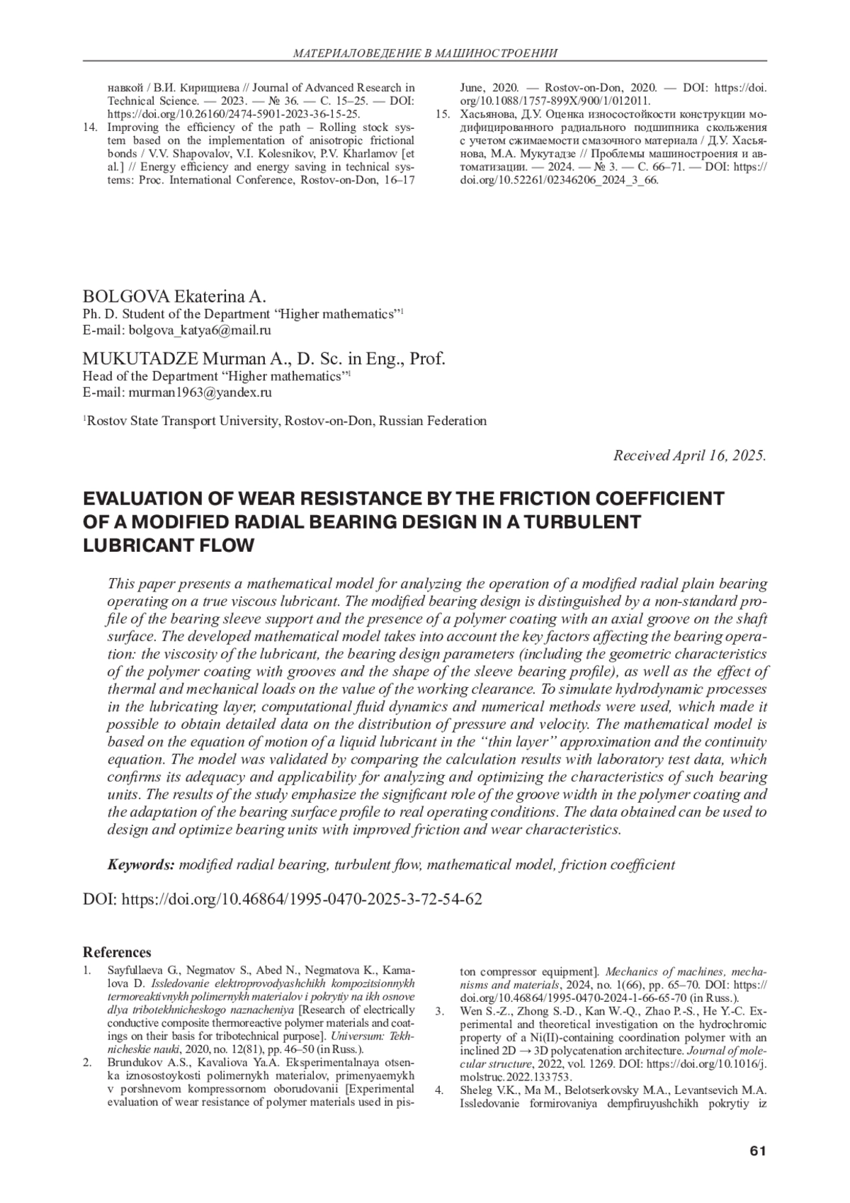 БОЛГОВА Е. А., МУКУТАДЗЕ М. А. ОЦЕНКА ИЗНОСОСТОЙКОСТИ ПО КОЭФФИЦИЕНТУ ТРЕНИЯ МОДИФИЦИРОВАННОЙ КОНСТРУКЦИИ РАДИАЛЬНОГО ПОДШИПНИКА ПРИ ТУРБУЛЕНТНОМ ТЕЧЕНИИ СМАЗКИ // МЕХАНИКА МАШИН, МЕХАНИЗМОВ И МАТЕРИАЛОВ. 2025. № 3 (72)