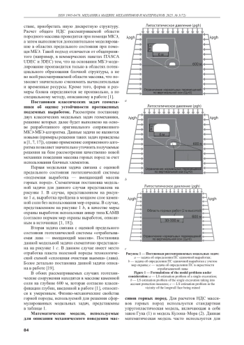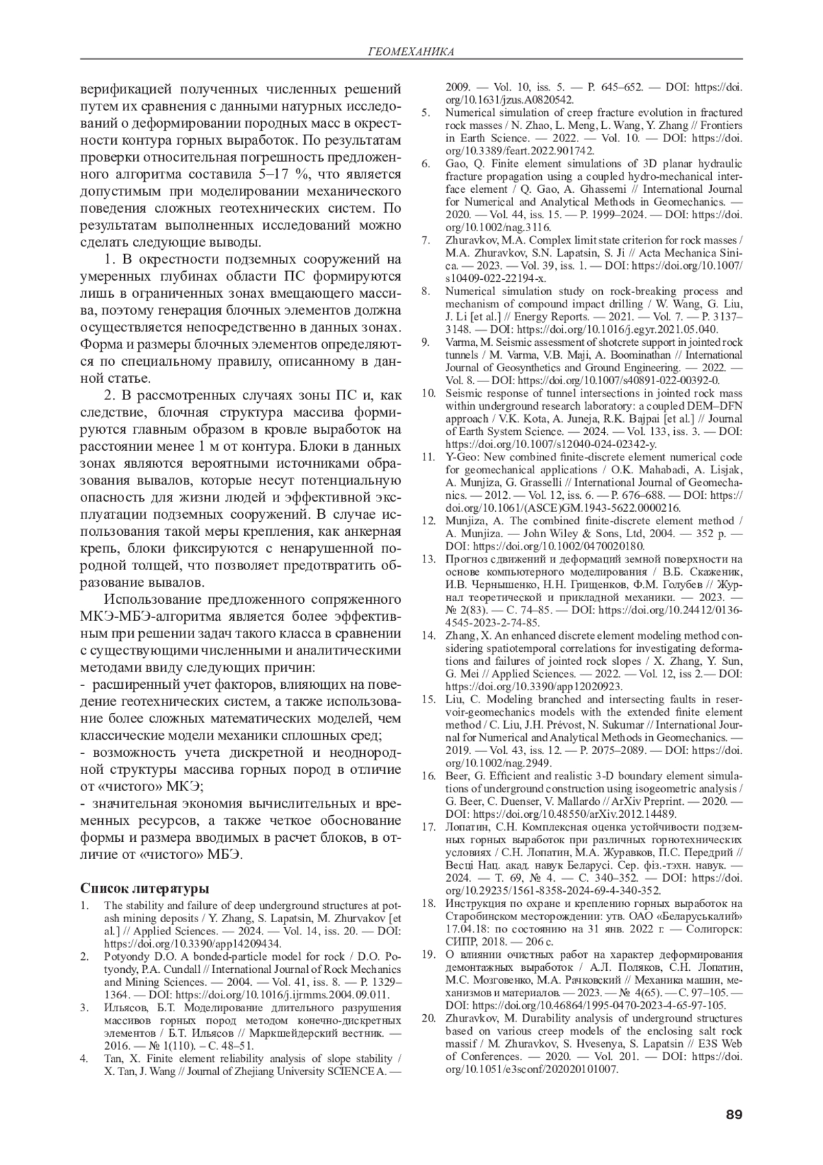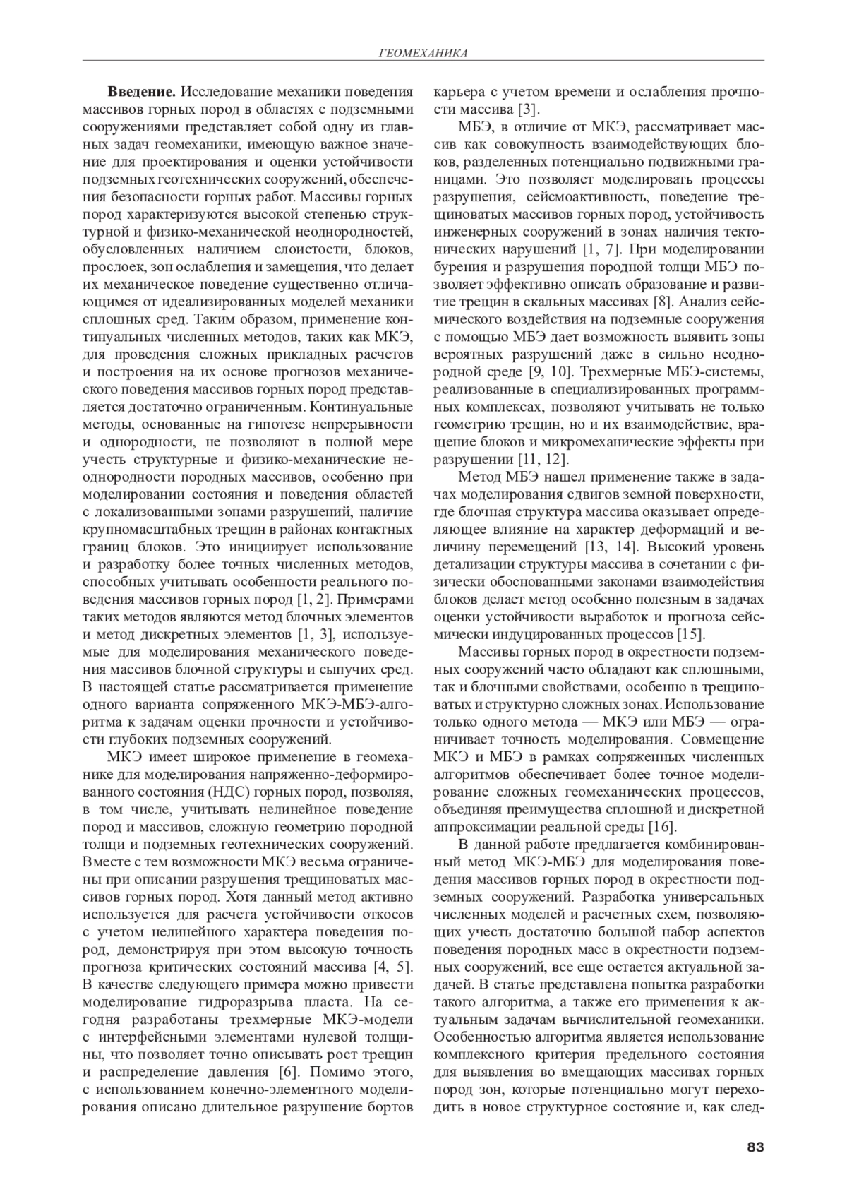 В работе предложен сопряженный алгоритм, представляющий собой комбинацию метода конечных элементов (МКЭ) и метода блочных элементов (МБЭ), для моделирования механического поведения массивов горных пород в окрестности глубоких подземных сооружений. МКЭ используется для расчета напряженно-деформированного состояния (НДС) вмещающего массива горных пород и выявления зон предельного состояния (ПС) в окрестности подземного сооружения посредством использования комплексного критерия предельного состояния. В таких зонах в дальнейшем применяется МБЭ для моделирования механического состояния области массива дискретной структуры с использованием деформируемых блочных элементов, что позволяет точно описывать локализованные зоны нарушения сплошности в массиве (разрушения, сдвигов и вывалов породных масс). Эффективность алгоритма подтверждена численным решением двух классических задач геомеханики: задачи об устойчивости одиночной выработки и задачи моделирования обрушения породных масс при ведении горных работ лавами применительно к месторождениям калийных солей Беларуси. Верификация результатов моделирования данными натурных замеров показала погрешность 5–17 % в количественных показателях при адекватном качественном повторении исследуемых геомеханических процессов. Среди преимуществ разработанного алгоритма учет неоднородности породных массивов (за счет использования методов механики дискретных сред), экономия вычислительных и временных ресурсов при проведении численных расчетов.
