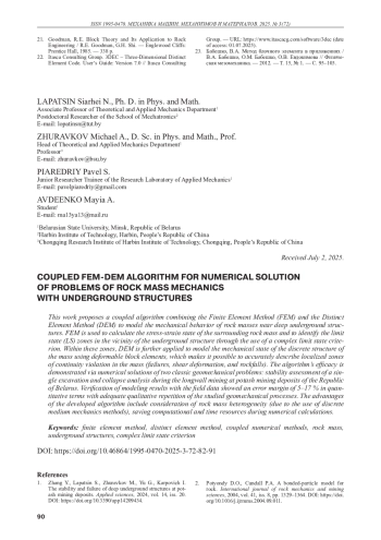 ЛОПАТИН С.Н., ЖУРАВКОВ М.А., ПЕРЕДРИЙ П.С., АВДЕЕНКО М.А. СОПРЯЖЕННЫЙ МКЭ-МБЭ-АЛГОРИТМ ДЛЯ ЧИСЛЕННОГО РЕШЕНИЯ ЗАДАЧ МЕХАНИКИ МАССИВОВ ГОРНЫХ ПОРОД С ПОДЗЕМНЫМИ СООРУЖЕНИЯМИ // МЕХАНИКА МАШИН, МЕХАНИЗМОВ И МАТЕРИАЛОВ. 2025. № 3 (72)