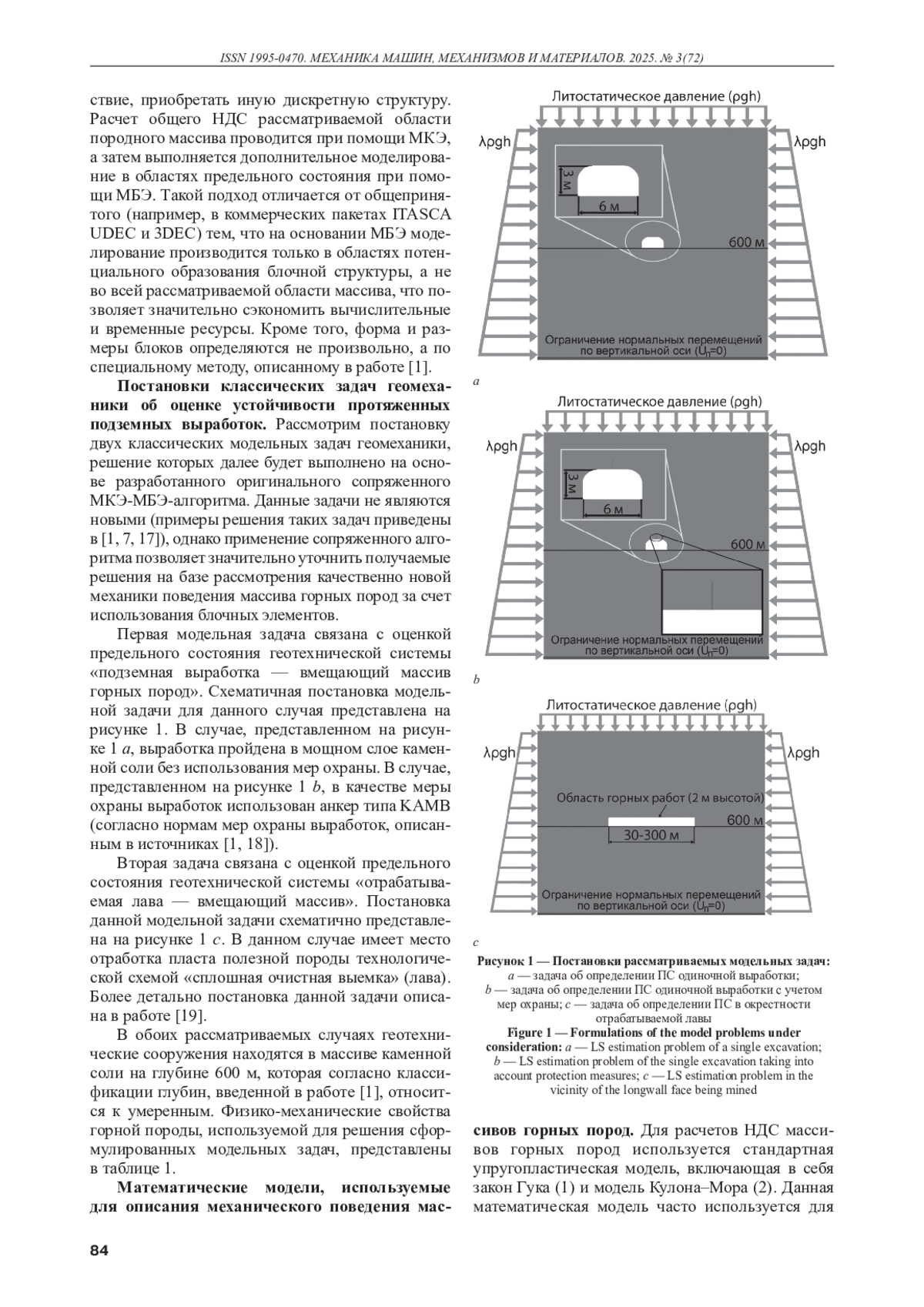 Статья: СОПРЯЖЕННЫЙ МКЭ-МБЭ-АЛГОРИТМ ДЛЯ ЧИСЛЕННОГО РЕШЕНИЯ ЗАДАЧ МЕХАНИКИ МАССИВОВ ГОРНЫХ ПОРОД С ПОДЗЕМНЫМИ СООРУЖЕНИЯМИ (2025)