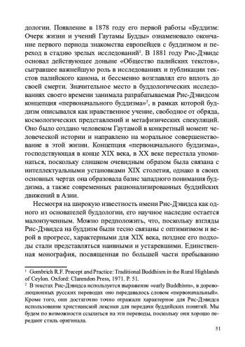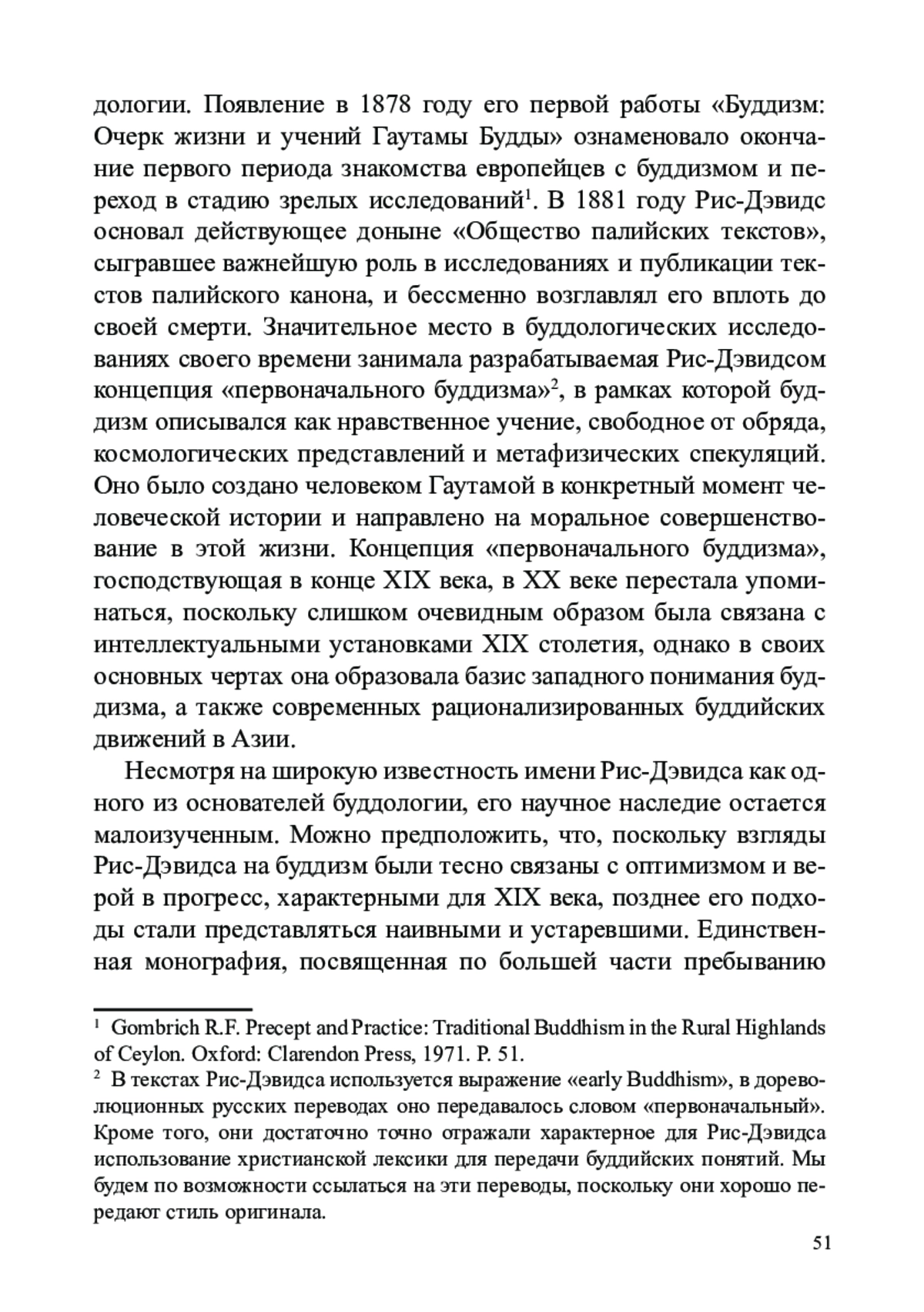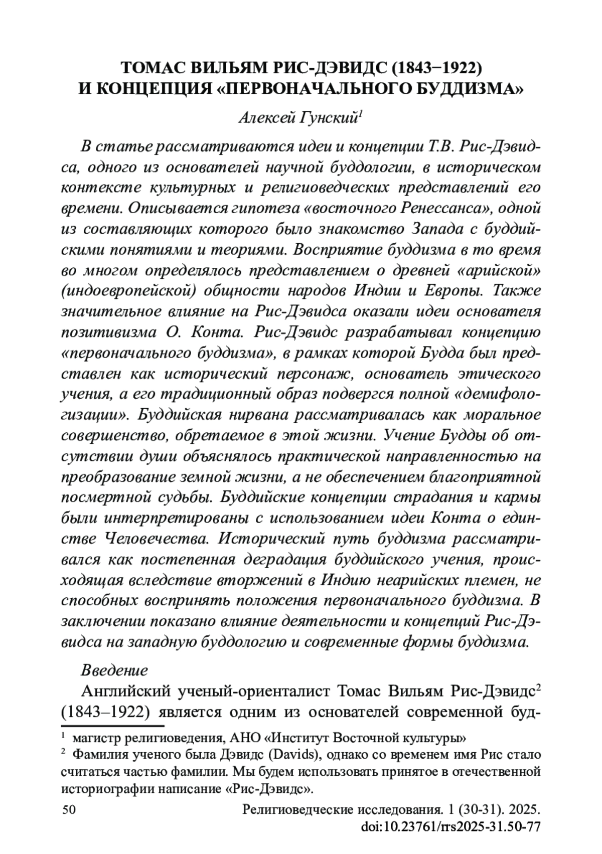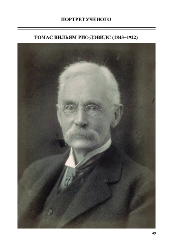 В статье рассматриваются идеи и концепции Т. В. Рис-Дэвидса, одного из основателей научной буддологии, в историческом контексте культурных и религиоведческих представлений его времени. Описывается гипотеза «восточного Ренессанса», одной из составляющих которого было знакомство Запада с буддийскими понятиями и теориями. Восприятие буддизма в то время во многом определялось представлением о древней «арийской» (индоевропейской) общности народов Индии и Европы. Также значительное влияние на Рис-Дэвидса оказали идеи основателя позитивизма О. Конта. Рис-Дэвидс разрабатывал концепцию «первоначального буддизма», в рамках которой Будда был представлен как исторический персонаж, основатель этического учения, а его традиционный образ подвергся полной «демифологизации». Буддийская нирвана рассматривалась как моральное совершенство, обретаемое в этой жизни. Учение Будды об отсутствии души объяснялось практической направленностью на преобразование земной жизни, а не обеспечением благоприятной посмертной судьбы. Буддийские концепции страдания и кармы были интерпретированы с использованием идеи Конта о единстве Человечества. Исторический путь буддизма рассматривался как постепенная деградация буддийского учения, происходящая вследствие вторжений в Индию неарийских племен, не способных воспринять положения первоначального буддизма. В заключении показано влияние деятельности и концепций Рис-Дэвидса на западную буддологию и современные формы буддизма.