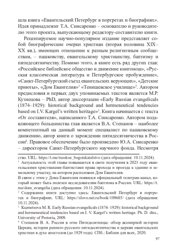 В 2024 году в издательском доме «Инкери» вышла книга «Евангельский Петербург в портретах и биографиях». Идея принадлежит Т. А. Снисаренко – основателю и руководителю этого проекта, выпускающему редактору-составителю книги.