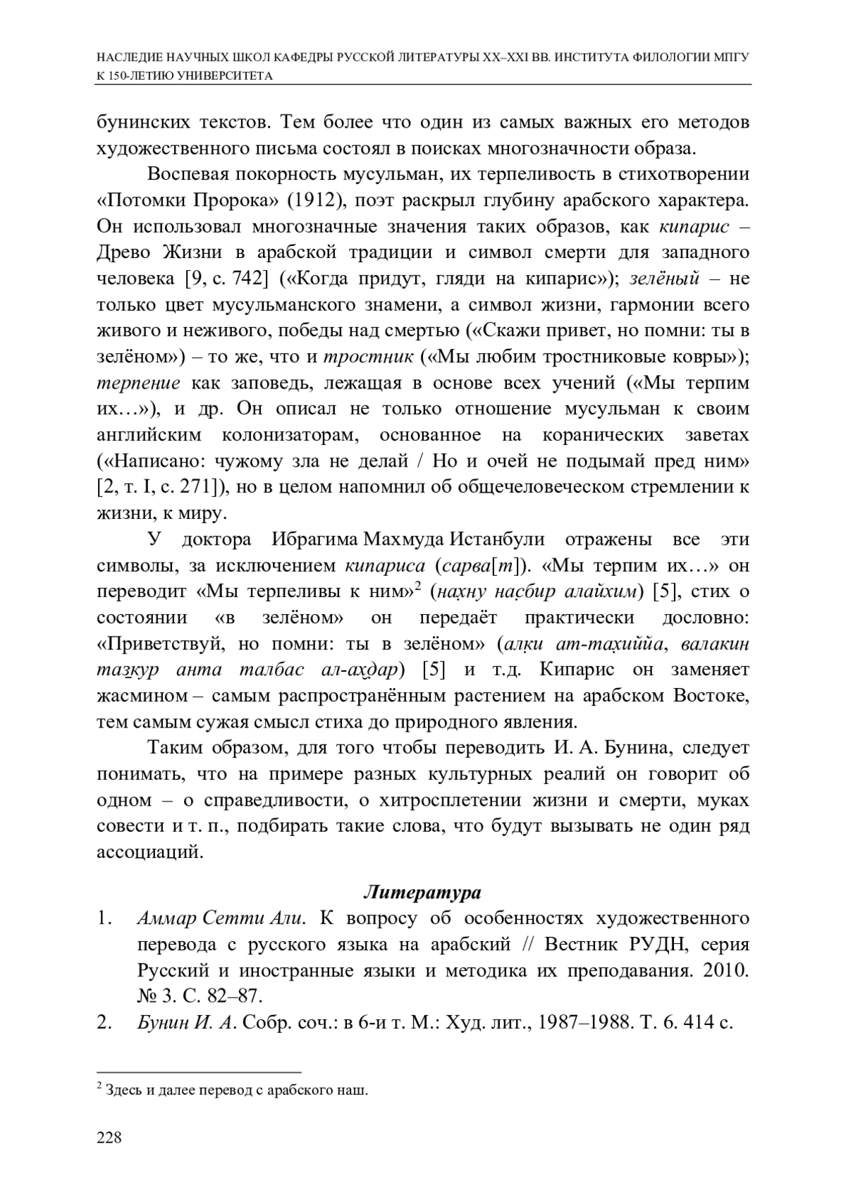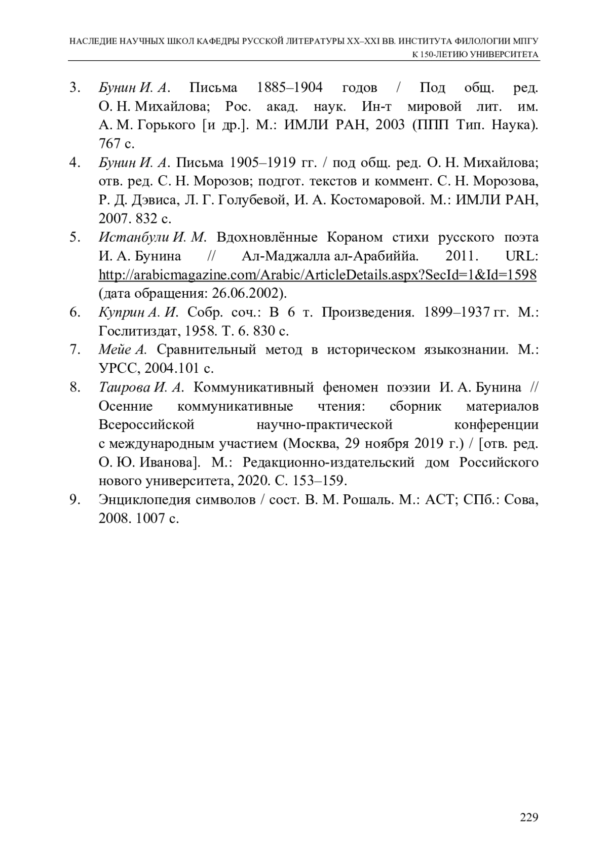 Таирова И.А. Смысловые и формальные трансформации художественных текстов И. А. Бунина в переводах на арабский язык // Наследие научных школ кафедры русской литературы XX-XXI вв. Института филологии МПГУ. К 150-летию университета. Материалы XXVII Шешуковских чтений. Под общей редакцией Л.А. Трубиной, сост. Л.А. Трубина, Д.В. Поль, И.С. Урюпин. Москва: МПГУ, 2023. С. 224-229.
