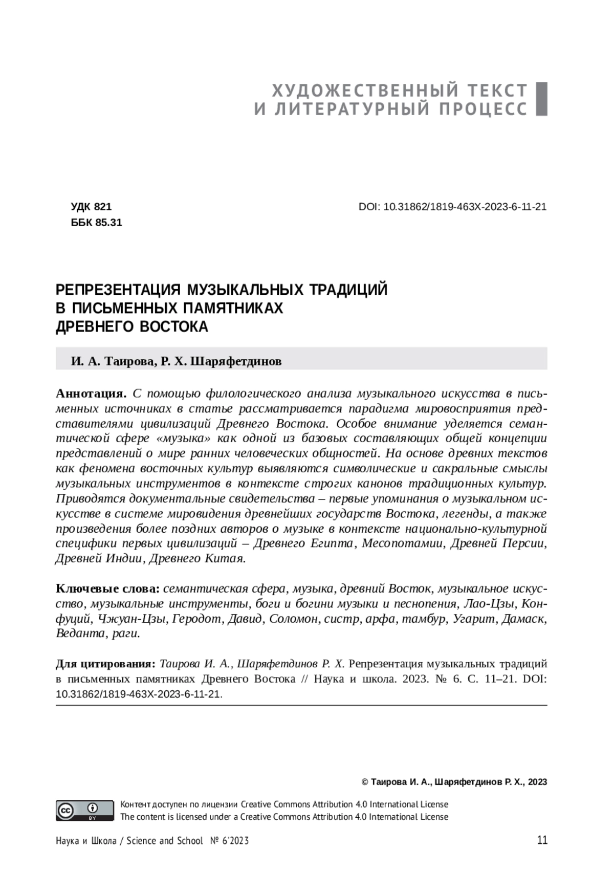 Таирова И.А., Шаряфетдинов Р.Х. РЕПРЕЗЕНТАЦИЯ МУЗЫКАЛЬНЫХ ТРАДИЦИЙ В ПИСЬМЕННЫХ ПАМЯТНИКАХ ДРЕВНЕГО ВОСТОКА