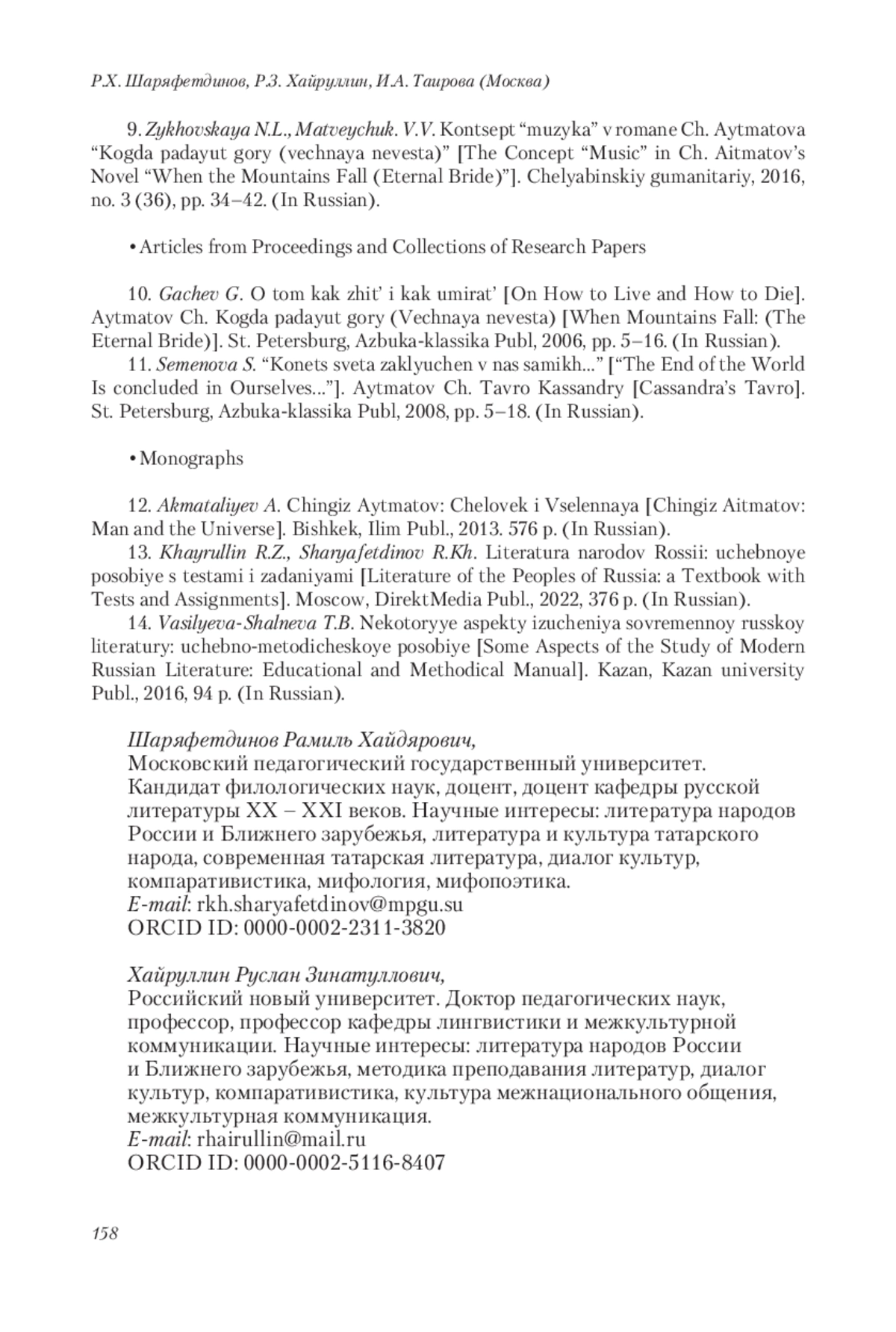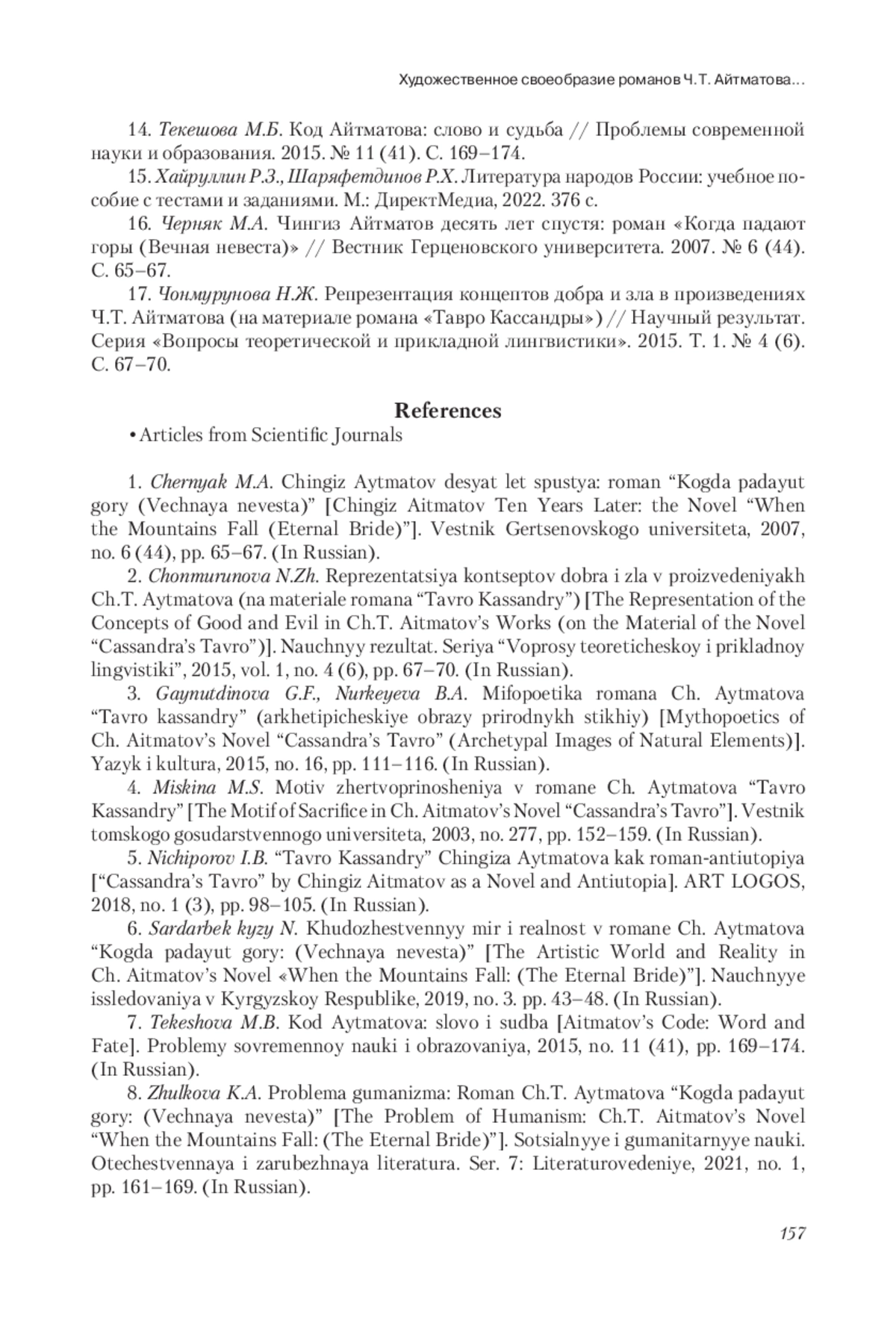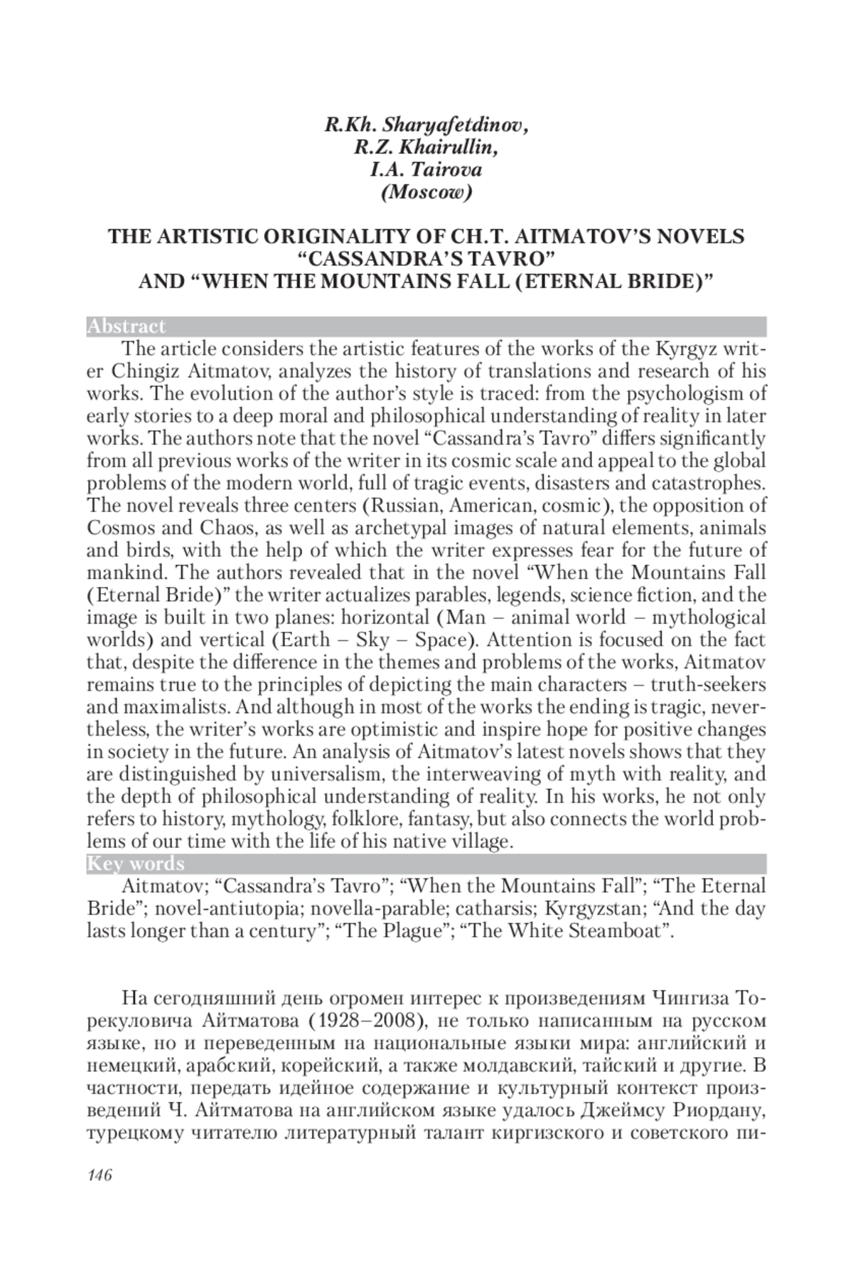 В статье рассмотрены художественные особенности произведений киргизского писателя Чингиза Айтматова, проанализирована история переводов и научных исследований его произведений. Прослежена эволюция авторского стиля: от психологизма ранних повестей к глубокому нравственно-философскому осмыслению действительности в позднем творчестве. Авторы отмечают, что роман «Тавро Кассандры» значительно отличается от всех предыдущих произведений писателя своей космической масштабностью и обращением к глобальным проблемам современного мира, полного трагических событий, бедствий и катастроф. В романе обнаружено три концентра (российский, американский, космический), оппозиция Космоса и Хаоса, а также архетипические образы природных стихий, животных и птиц, с помощью которых писатель выражает опасение за будущее человечества. Авторы выявили, что в романе «Когда па дают горы (Вечная невеста)» писатель актуализирует притчи, легенды, научную фантастику, а изображение строится в двух плоскостях: горизонтальной (Человек – животный мир – мифологические миры) и вертикальной (Земля – Небо – Космос). Акцентируется внимание на том, что, несмотря на различие тематики и проблематики произведений, Айтматов остается верен принципам изображения главных героев –правдолюбцев и максималистов. И хотя в большинстве произведений финал трагичен, тем не менее, творения писателя оптимистичны и вселяют надежду на положительные изменения в обществе в будущем. Анализ последних романов Айтматова показывает, что их отличает универсализм, переплетение мифа с реальностью и глубина философского осмысления действительности. В своих произведениях он не только обращается к истории, мифологии, фольклору, фантастике, но и сопрягает мировые проблемы современности с жизнью родного аула.
