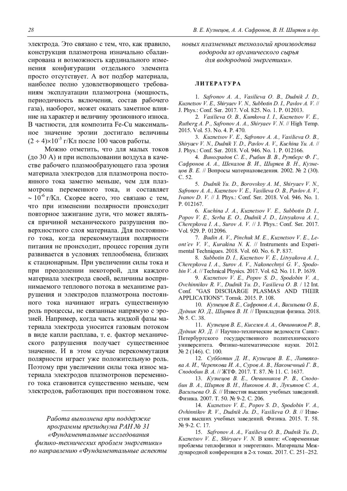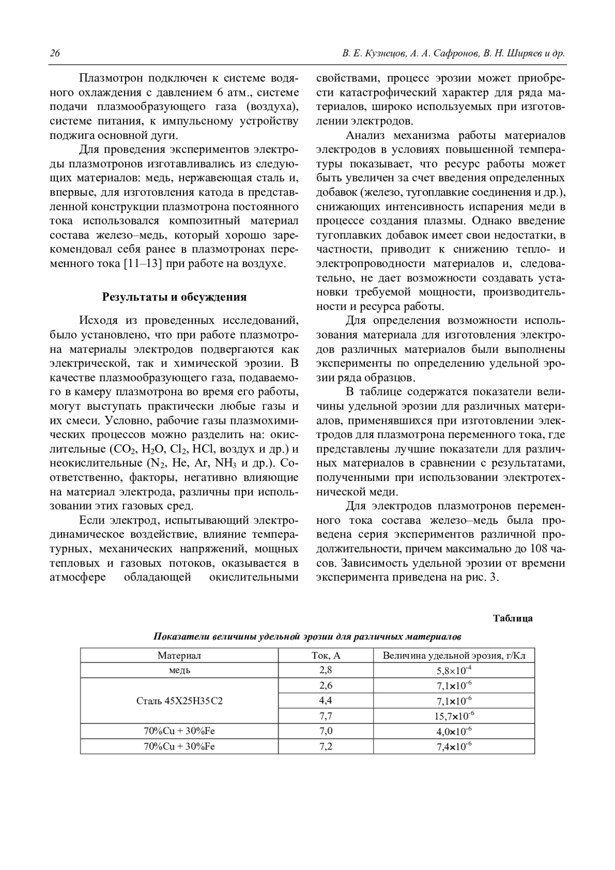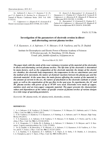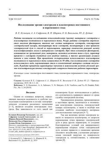 Кузнецов В. Е., Сафронов А. А., Ширяев В. Н., Васильева О. Б., Дудник Ю. Д. Исследование эрозии электродов в плазмотронах постоянного и переменного тока 24