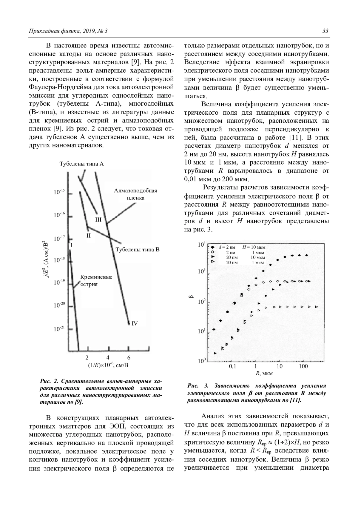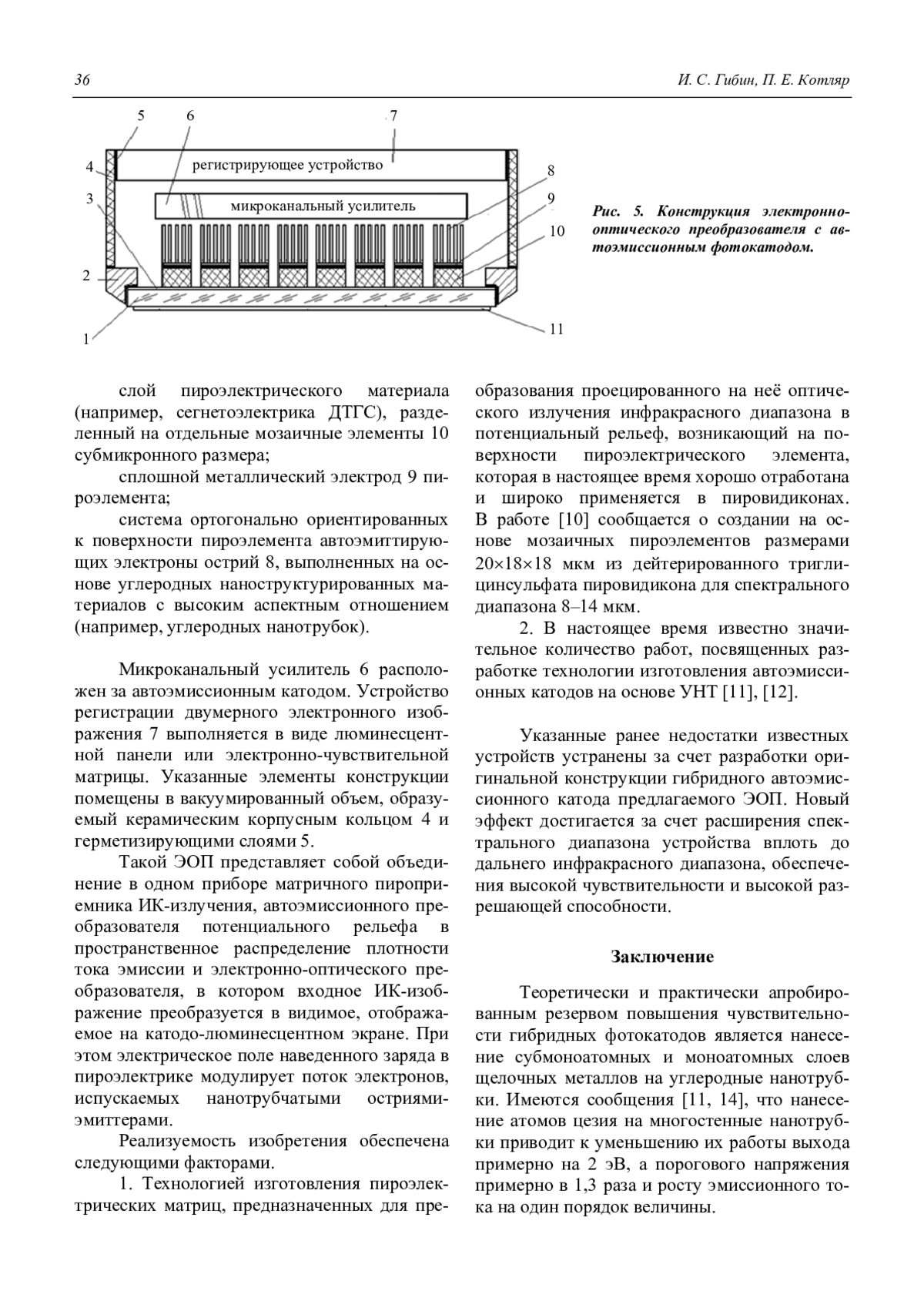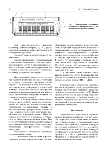 Теоретически и практически апробированным резервом повышения чувствительности гибридных фотокатодов является нанесение субмоноатомных и моноатомных слоев щелочных металлов на углеродные нанотрубки. Имеются сообщения [11, 14], что нанесение атомов цезия на многостенные нанотрубки приводит к уменьшению их работы выхода примерно на 2 эВ, а порогового напряжения примерно в 1,3 раза и росту эмиссионного тока на один порядок величины. Прикладная физика, 2019, № 3 37 Разработка и создание электроннооптических преобразователей с гибридными автоэмиссионными фотокатодами, обладающими высокой чувствительностью во всем инфракрасном диапазоне и работающими без охлаждения, является важным этапом в развитии инфракрасной техники и альтернативой традиционным тепловизионным системам и приборам ночного видения. Расширение длинноволновой границы спектральной чувствительности электроннооптических преобразователей изображения в область среднего и дальнего инфракрасного диапазонов (до 40 мкм) с одновременным повышением их чувствительности фактически переводит ЭОП из класса приборов ночного видения в класс тепловизионных приборов (пирометры, тепловизоры).