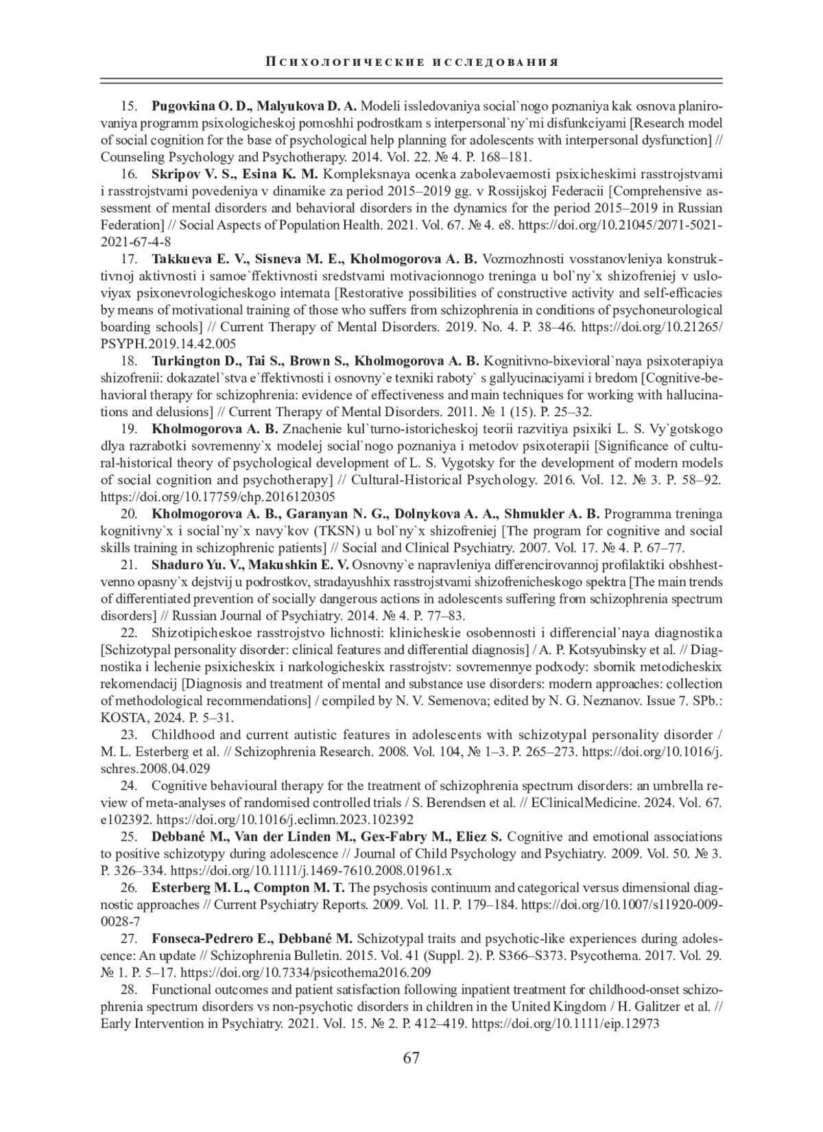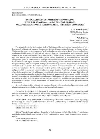 КОВАЛЬ-ЗАЙЦЕВ А. А., БРИТОВА В. С. ИНТЕГРАТИВНАЯ ПСИХОТЕРАПИЯ В РАБОТЕ С ЭМОЦИОНАЛЬНО-ЛИЧНОСТНОЙ СФЕРОЙ ПОДРОСТКОВ С ЗАБОЛЕВАНИЯМИ ШИЗОФРЕНИЧЕСКОГО СПЕКТРА // СИСТЕМНАЯ ПСИХОЛОГИЯ И СОЦИОЛОГИЯ. 2025. № 2 (54)